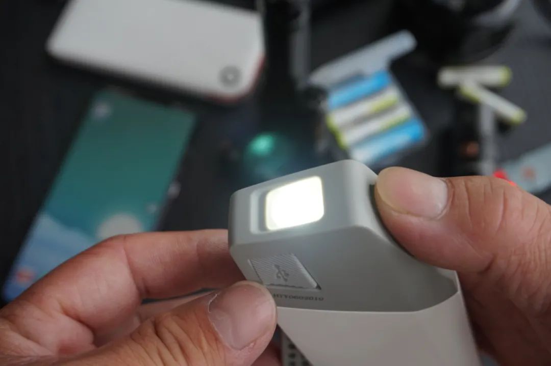 打開鎖定開關(guān),握把自動(dòng)彈出,設(shè)計(jì)非常有意思,這個(gè)必須給設(shè)計(jì)師加雞腿。很難想象如果側(cè)面設(shè)計(jì)成手搖式,需要兩只手操作,補(bǔ)光照明非常的不方便。而手捏完全沒有這樣的問題,燈光指向性完全不受影響。實(shí)際在行走過程中按壓,沒有一絲絲影響。