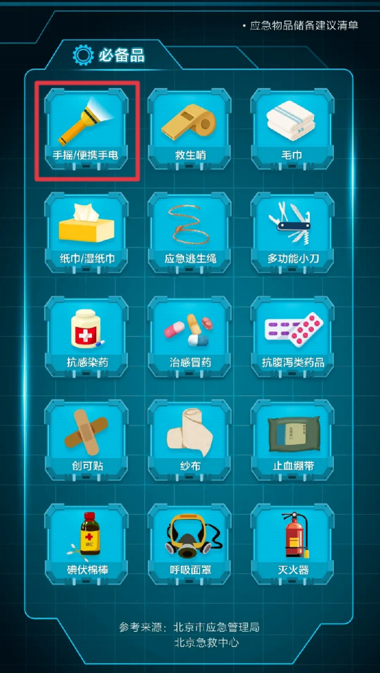 突發(fā)事件考驗(yàn)人的應(yīng)急處理能力,讓人認(rèn)識(shí)到了儲(chǔ)備應(yīng)急物資的重要性。上圖是2020年北京應(yīng)急管理局提供的部分應(yīng)急包清單,必備品的第一項(xiàng)是手電,求生哨、逃生繩、多功能刀這類都是應(yīng)急包重要裝備。