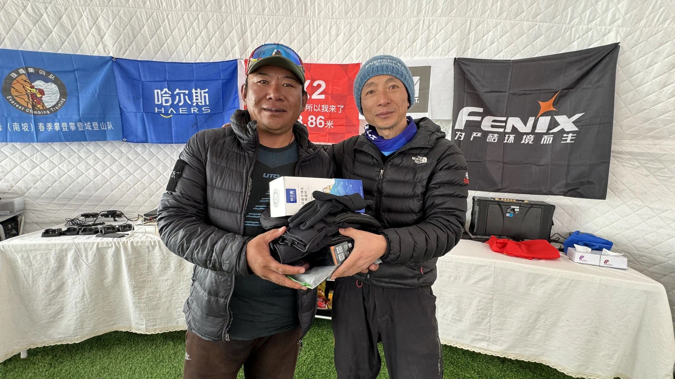 沖頂前,寶龍手持Fenix CL28R/Fenix HM65R-T V2.0在珠峰南坡二號營地拍照留念