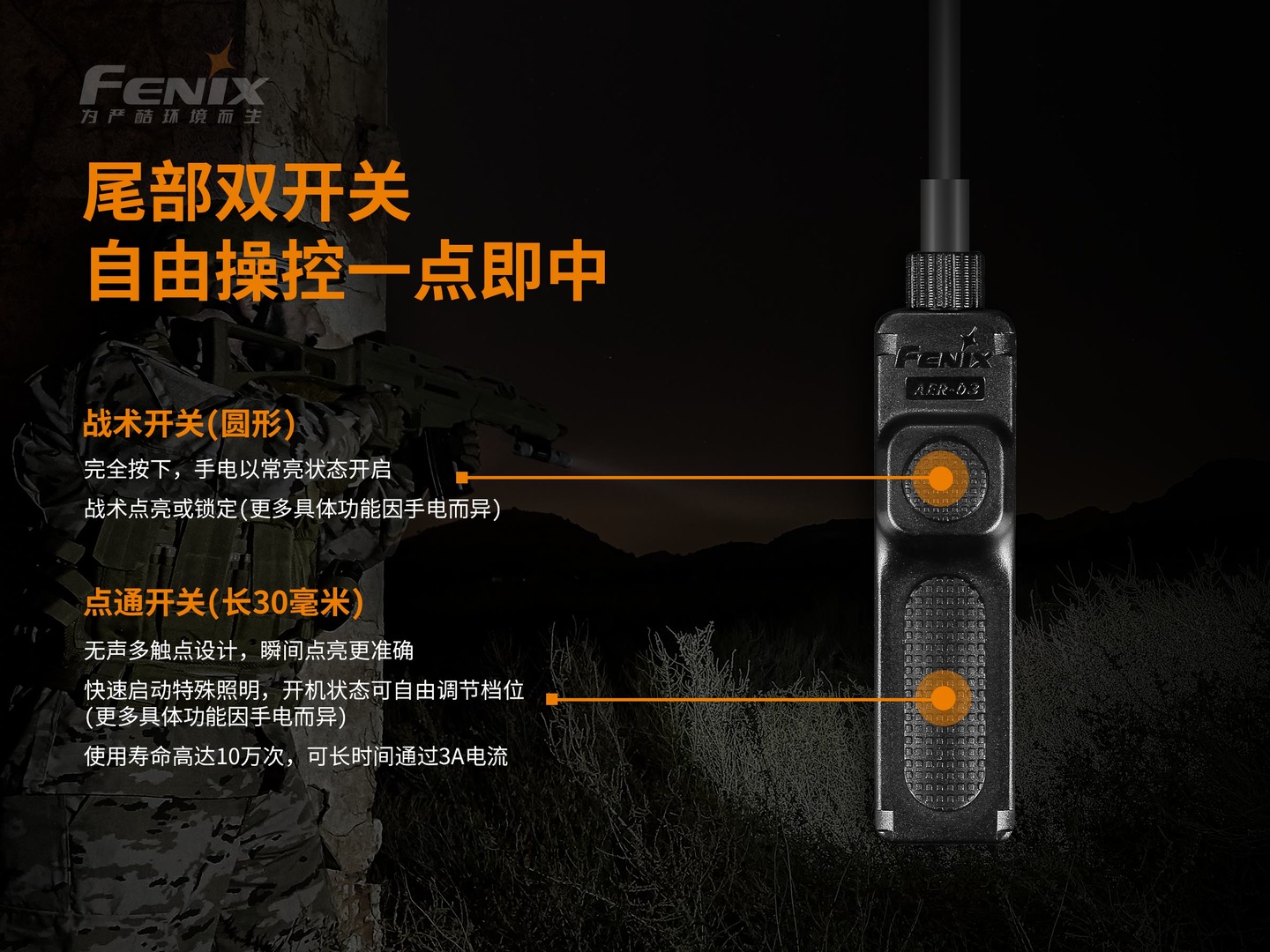 點(diǎn)通開關(guān)(長30毫米)快速啟動(dòng)爆閃或特殊照明,并在開機(jī)狀態(tài)下可自由調(diào)節(jié)檔位(更多具體功能因手電而異),使用壽命高達(dá)10萬次,可長時(shí)間通過3A電流