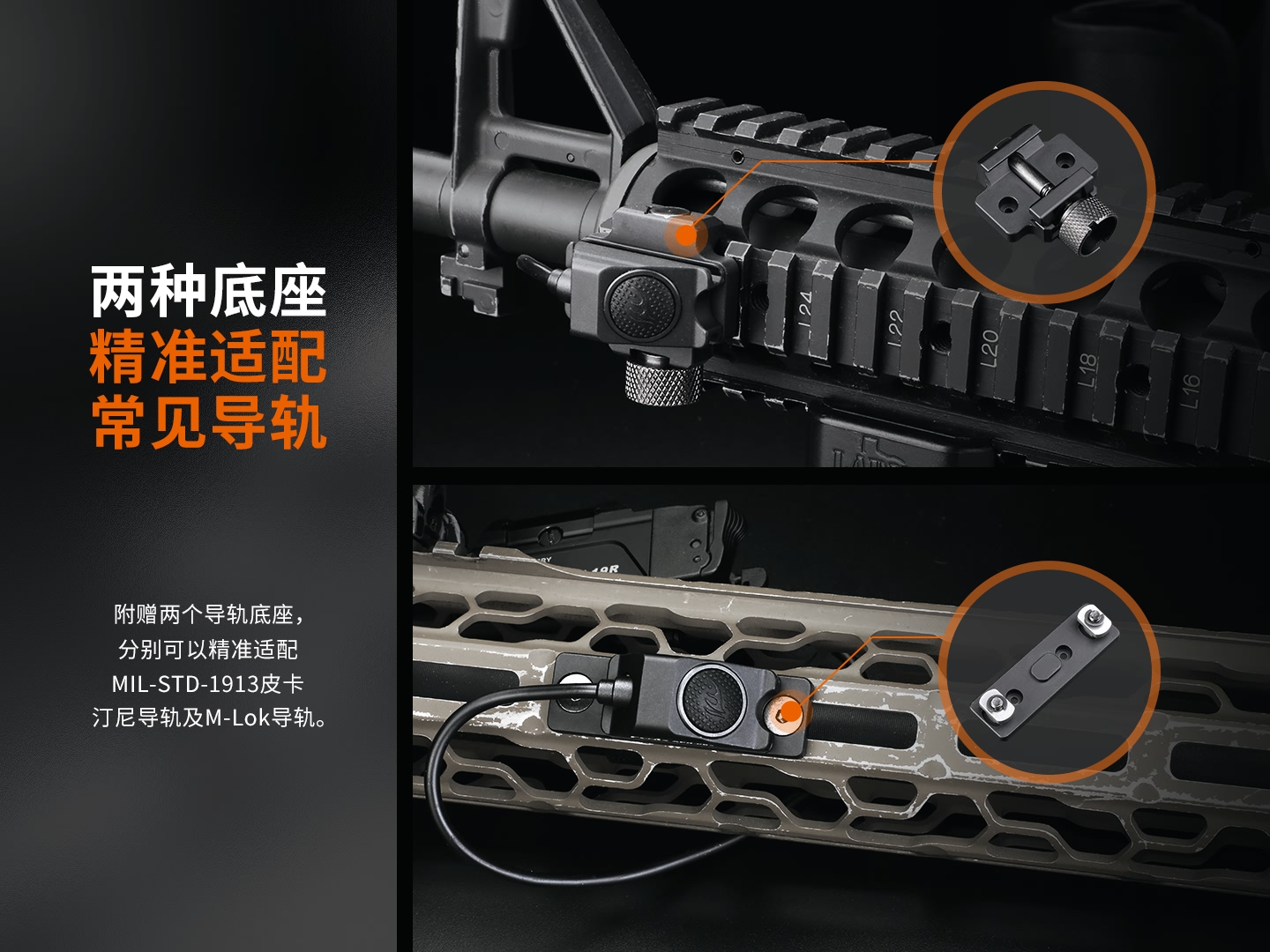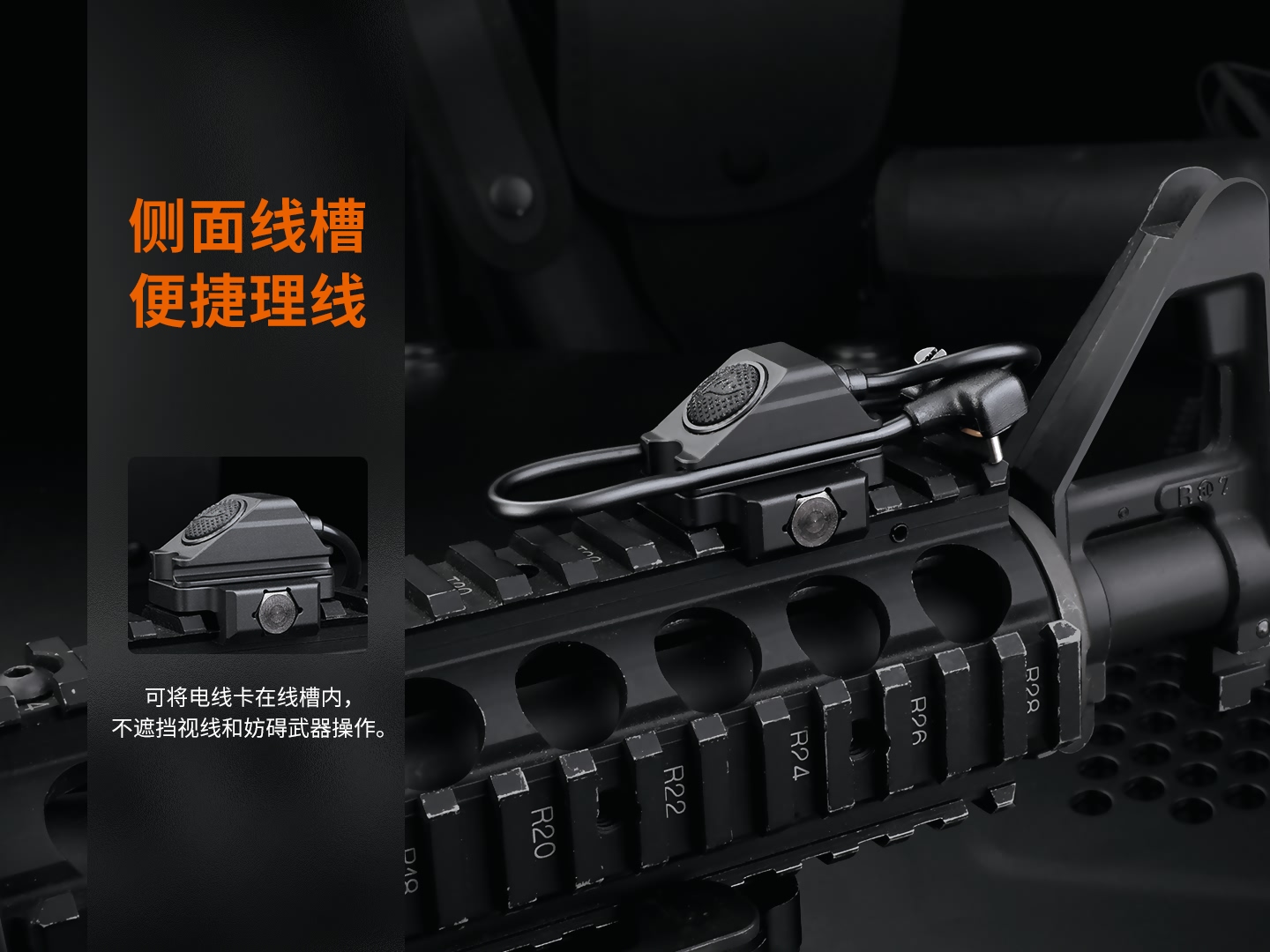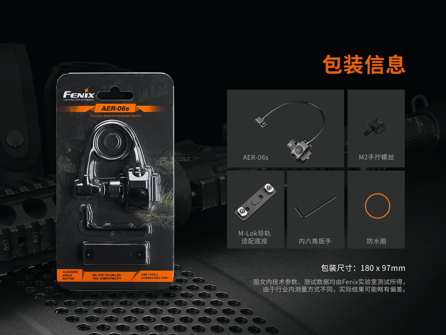 Fenix AER-06s 是一款革命性的武器電子配件控制裝置。線控開關(guān)接口適用于Fenix GL19R手槍燈的type C充電接口。單一的電子開關(guān)設(shè)計(jì),按鍵呈斜向上45度角,可實(shí)現(xiàn)開關(guān)機(jī)、戰(zhàn)術(shù)點(diǎn)亮和爆閃等功能,同時(shí)支持輸出手電的最高亮度。具備IPx6的防護(hù)等級,可應(yīng)對嚴(yán)酷環(huán)境。標(biāo)配皮卡丁尼導(dǎo)軌夾具底座,配件亦附有M-Lok導(dǎo)軌底座,兩種底座供您隨心選擇。