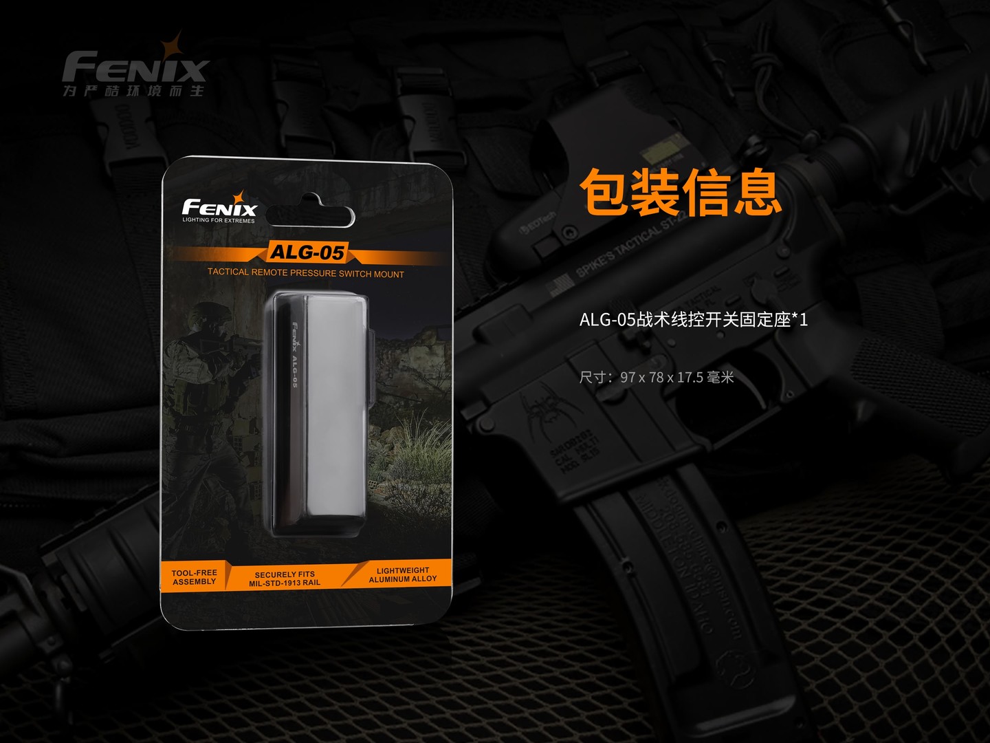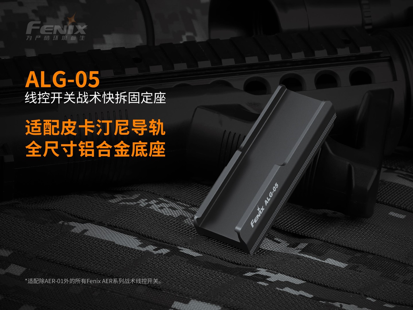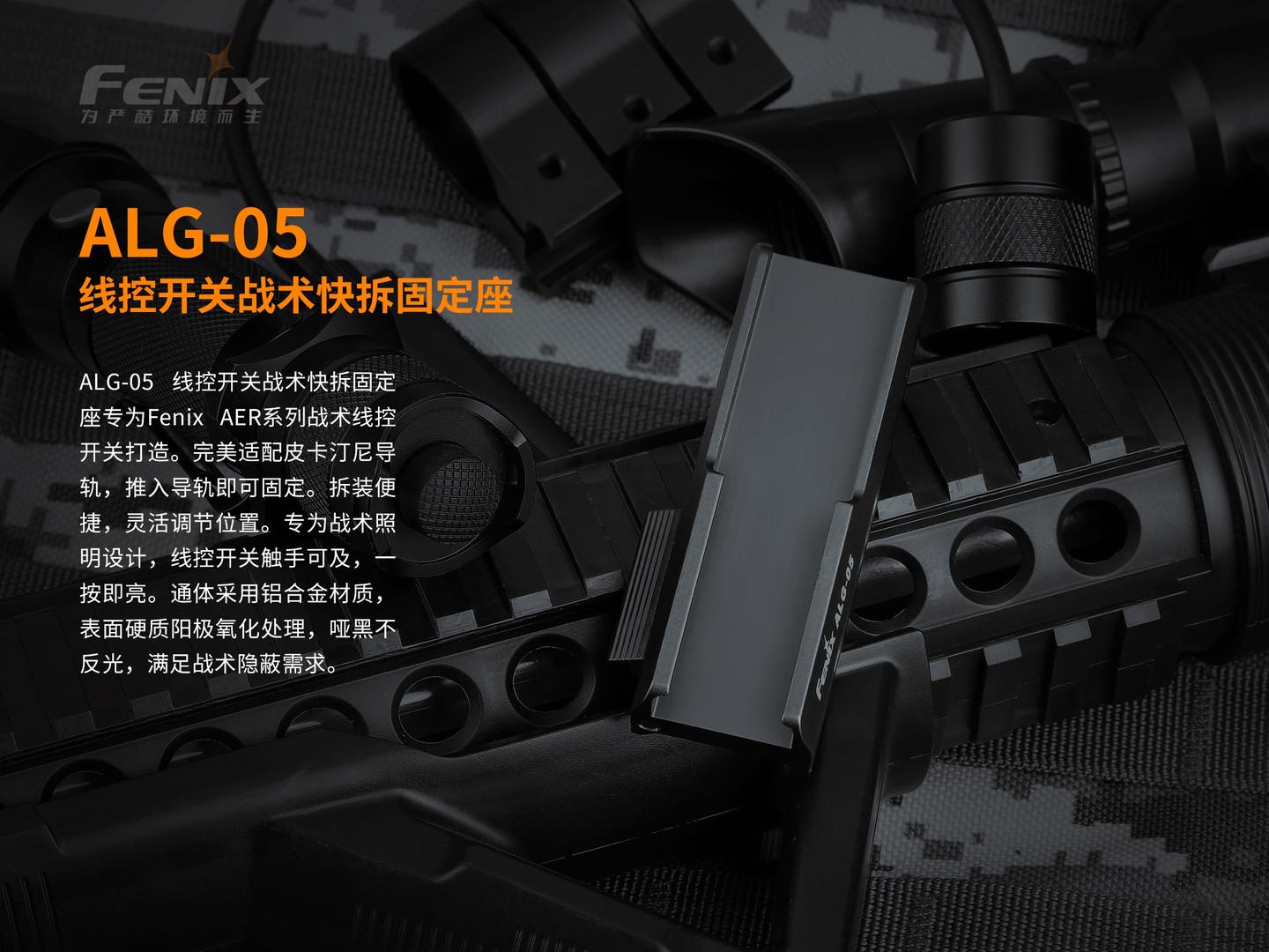 ALG-05 戰(zhàn)術(shù)線控開關(guān)固定座專為Fenix AER系列戰(zhàn)術(shù)線控開關(guān)打造。適配皮卡汀尼導軌,推入導軌即可固定。拆裝便捷,靈活調(diào)節(jié)位置。專為戰(zhàn)術(shù)照明設(shè)計,線控開關(guān)觸手可及,一按即亮。通體采用鋁合金材質(zhì),表面硬質(zhì)陽極氧化處理,啞黑不反光,滿足戰(zhàn)術(shù)隱蔽需求。