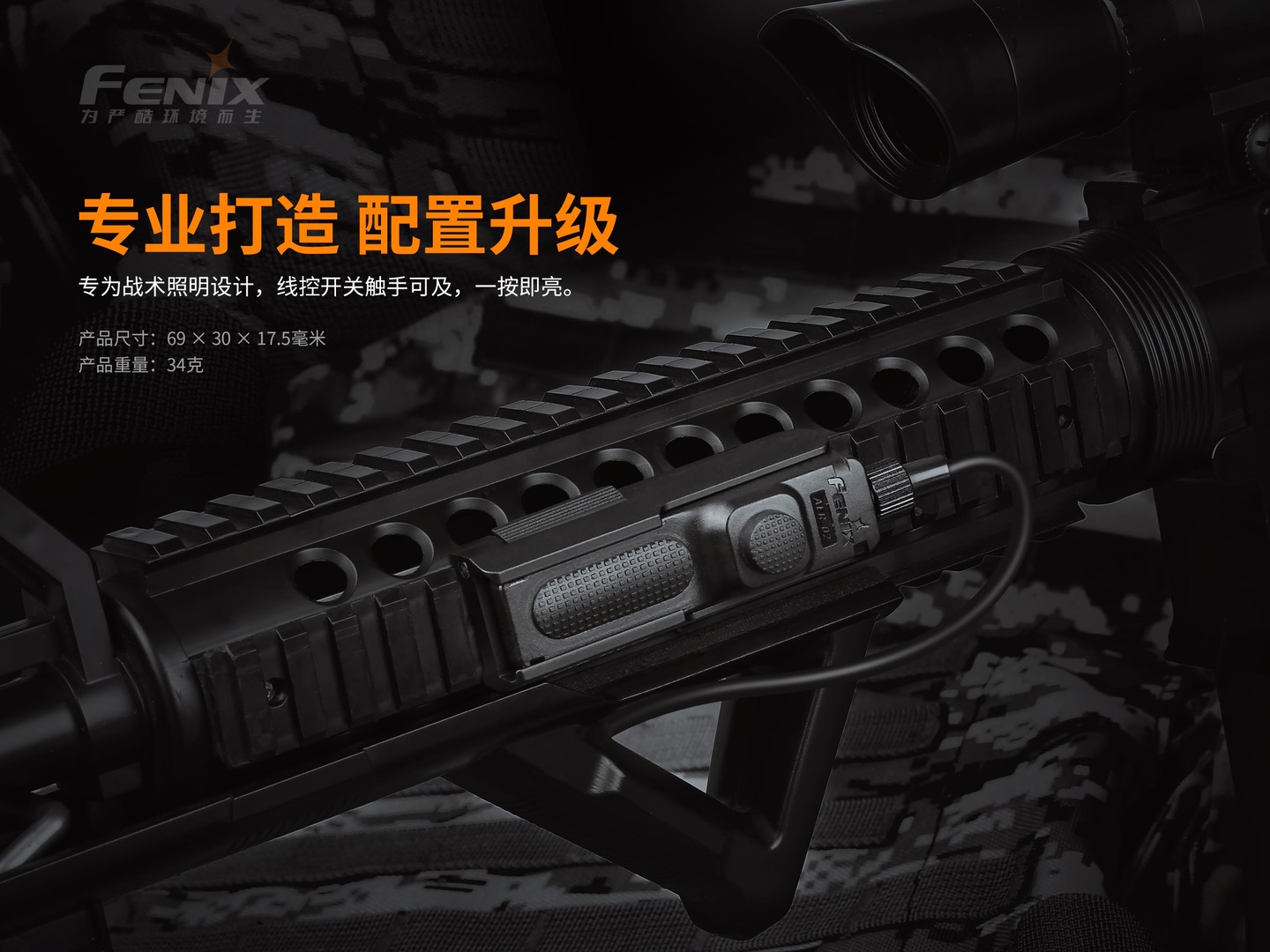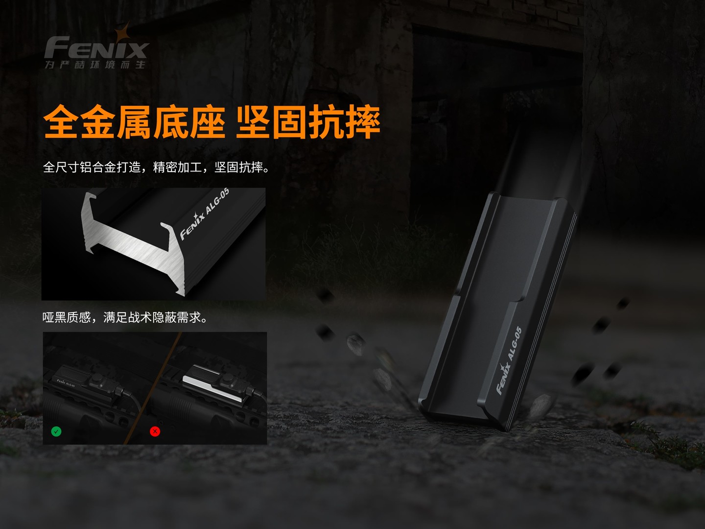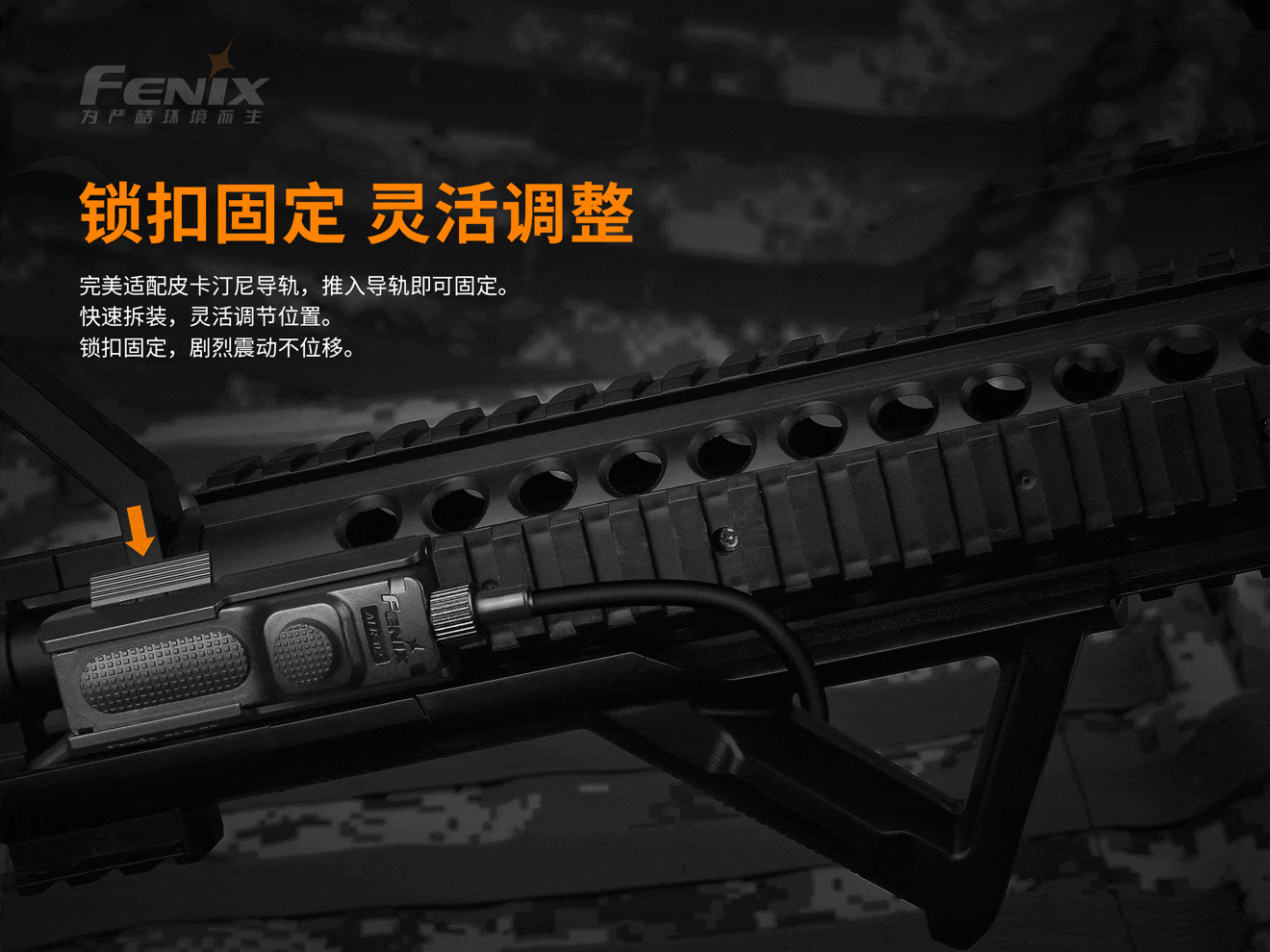 ALG-05 戰(zhàn)術(shù)線控開關(guān)固定座專為Fenix AER系列戰(zhàn)術(shù)線控開關(guān)打造。適配皮卡汀尼導軌,推入導軌即可固定。拆裝便捷,靈活調(diào)節(jié)位置。專為戰(zhàn)術(shù)照明設(shè)計,線控開關(guān)觸手可及,一按即亮。通體采用鋁合金材質(zhì),表面硬質(zhì)陽極氧化處理,啞黑不反光,滿足戰(zhàn)術(shù)隱蔽需求。