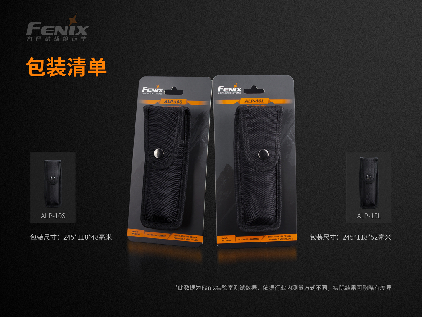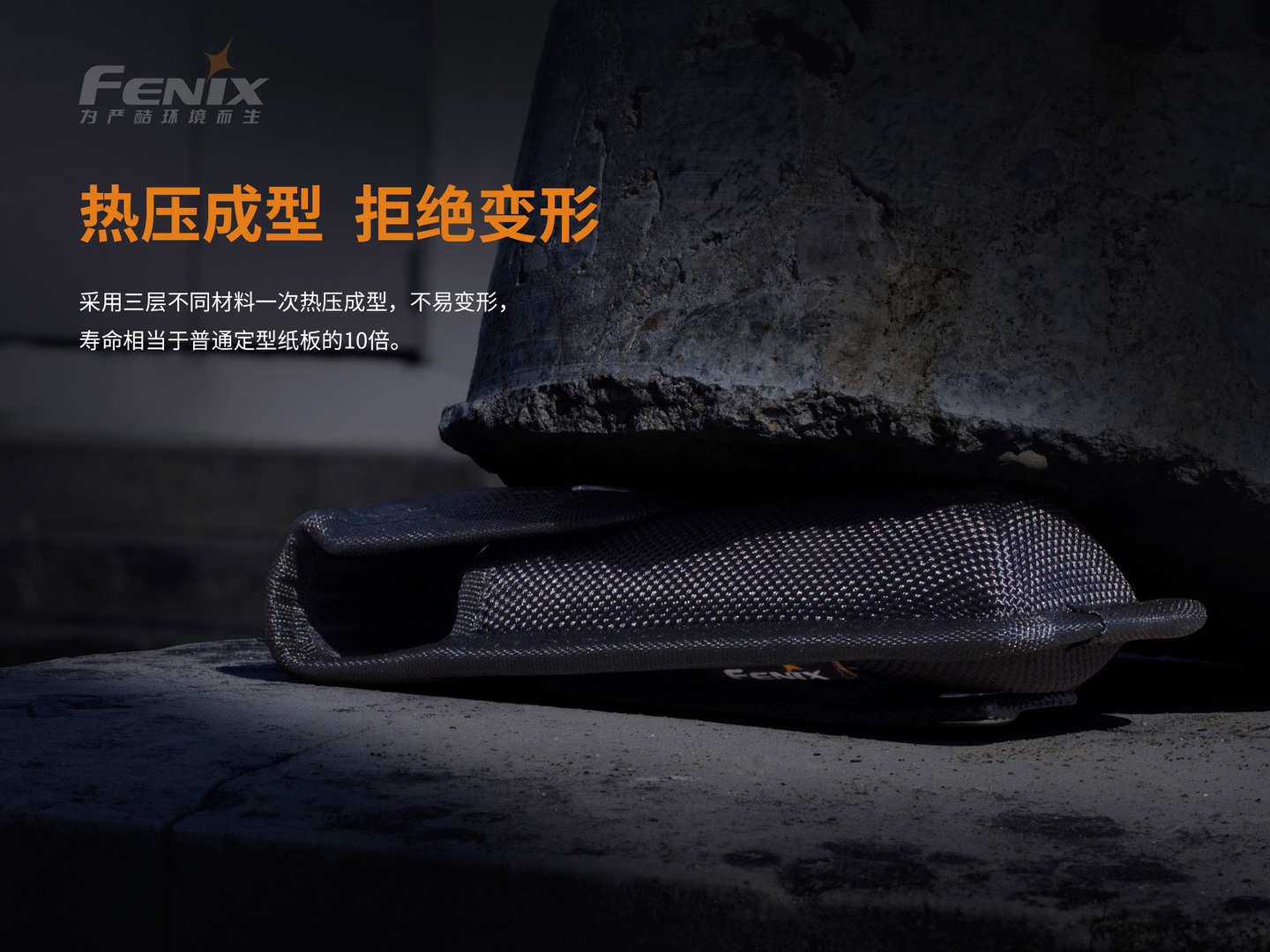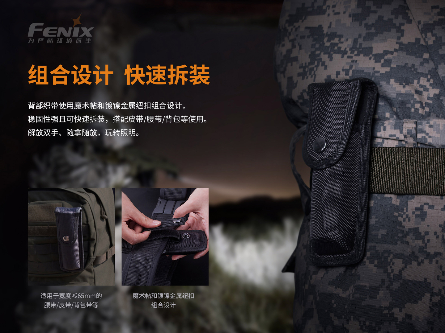 Fenix ALP-10是專為手電設(shè)計(jì)的保護(hù)套。選用抗撕裂尼龍材料,抗磨性能優(yōu)良;采用三層不同材料一次熱壓成型,堅(jiān)硬有型,持久耐用;背部織帶使用魔術(shù)帖和鍍鎳金屬紐扣組合設(shè)計(jì),穩(wěn)固性強(qiáng)且可快速拆裝,可搭配皮帶/腰帶/背包等使用。在戰(zhàn)術(shù)執(zhí)勤、戶外照明、搜索救援等多種場景中,全方位保護(hù)手電。