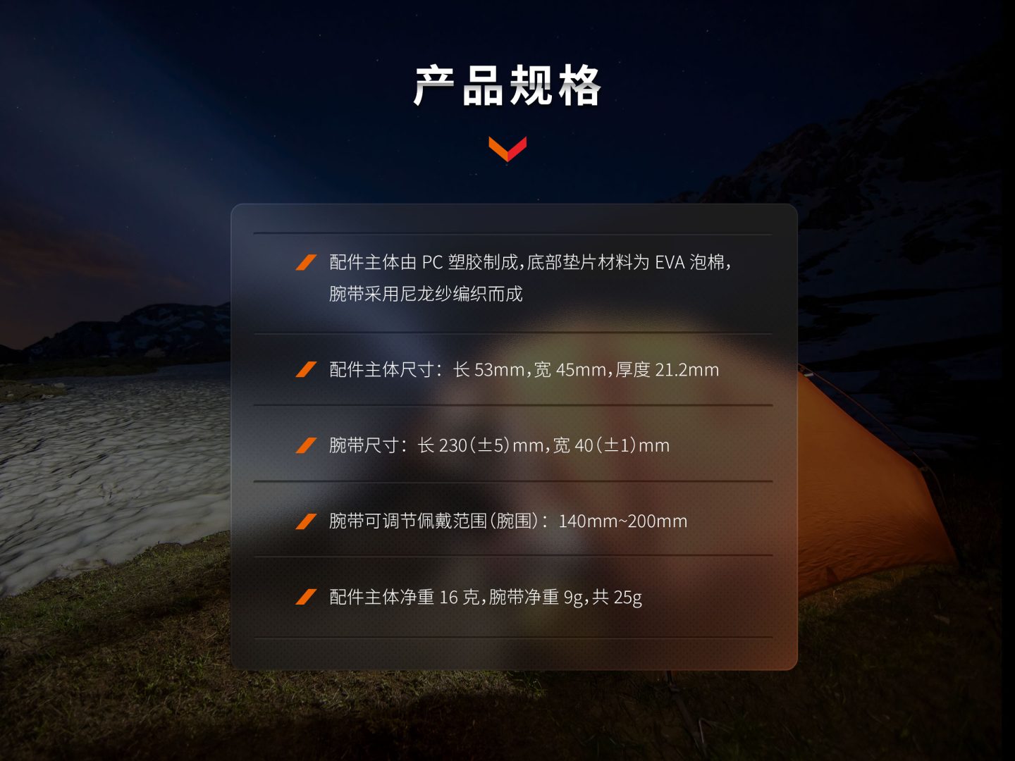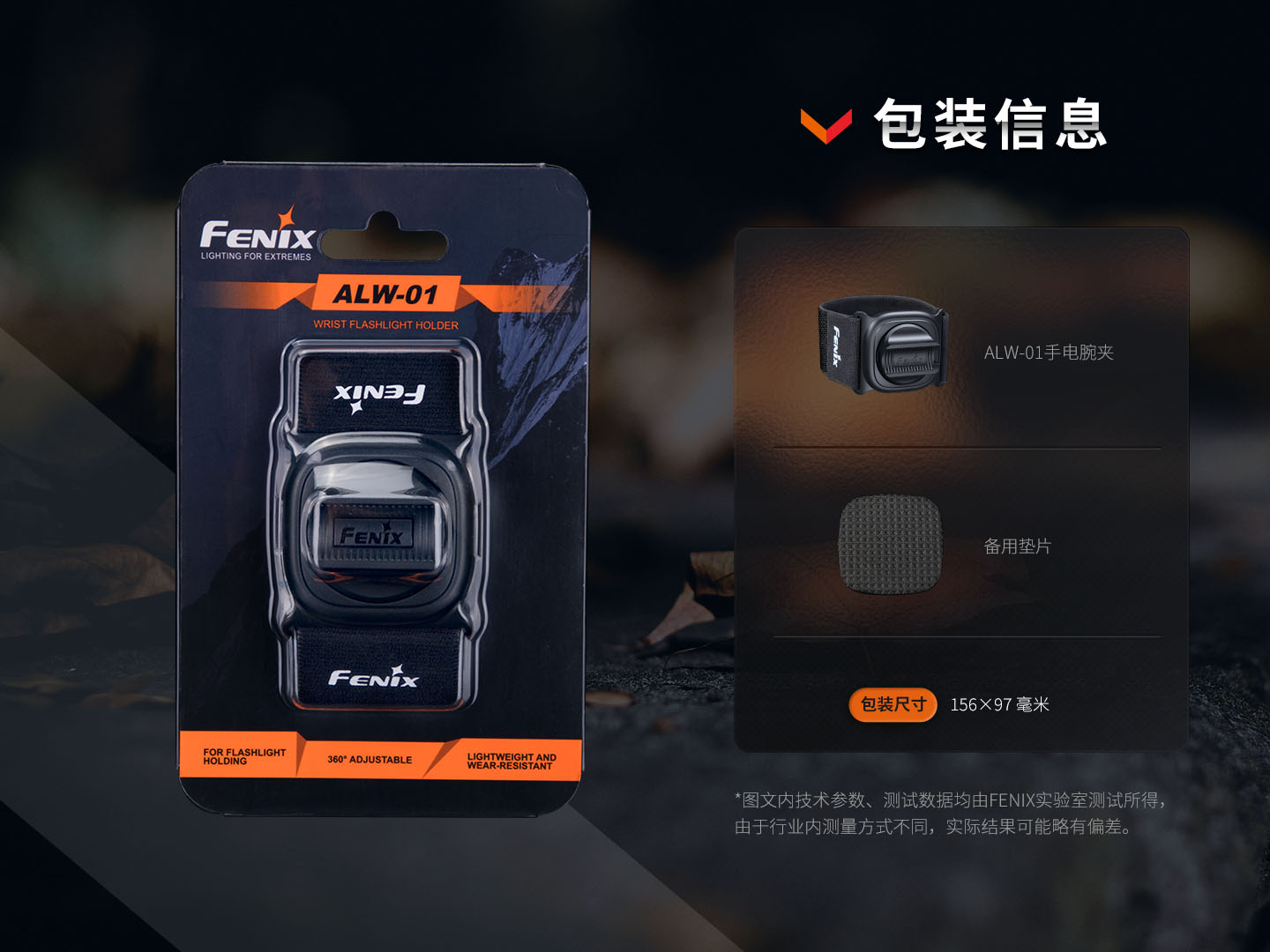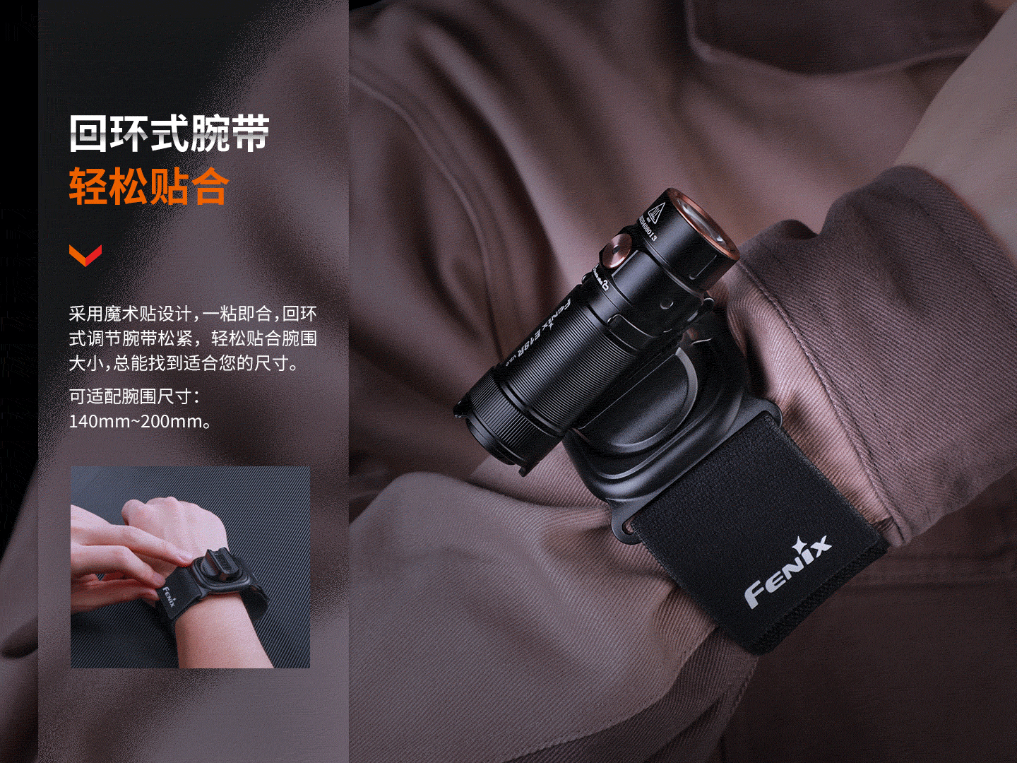 Fenix ALW-01手電腕夾是針對配備抱夾的小型手電的穿戴式配件,可用于夾持品牌旗下的E12 V2.0,E16,E18R V2.0等配備抱夾的小型手電筒。該配件主體由塑膠制成,腕夾可360°旋轉(zhuǎn)調(diào)節(jié),靈活輕便,堅固耐用,腕帶采用尼龍紗編織而成,可適戴腕圍尺寸為140mm-200mm,輕松貼合腕圍大小,佩戴舒適,強韌耐磨。