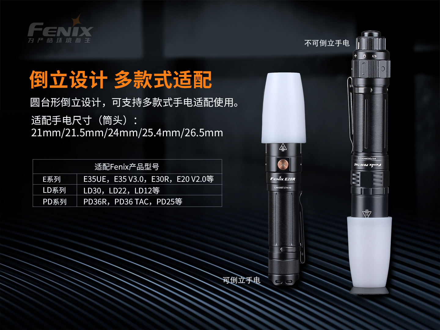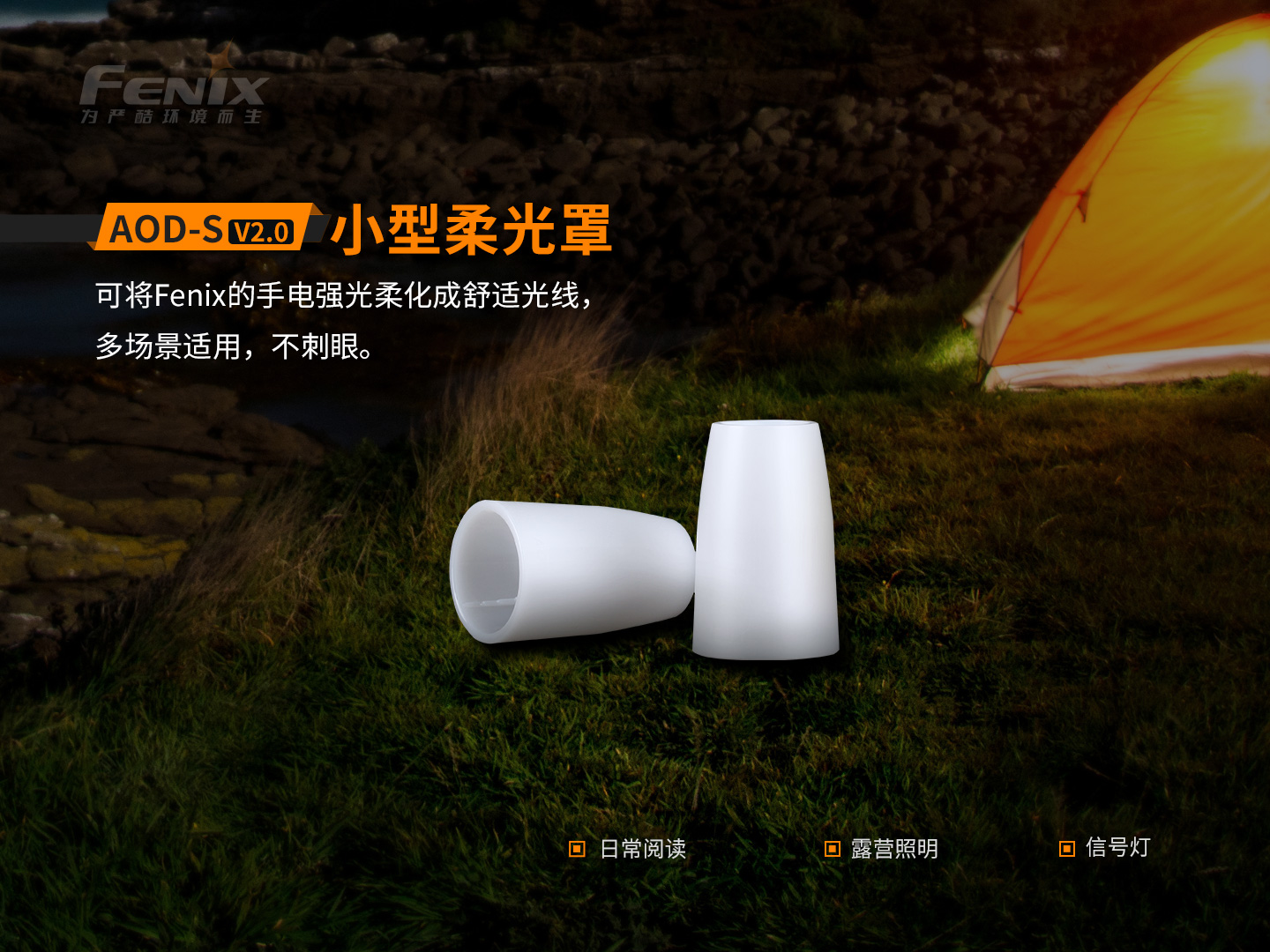 Fenix AOD-S V2.0是一款可倒立的小型柔光罩,選用進口PC材料制作,透光率高,同時具備超強抗壓力、抗沖擊等特性, 可將Fenix的手電強光柔化,方便日常閱讀、露營照明、信號燈使用等等。