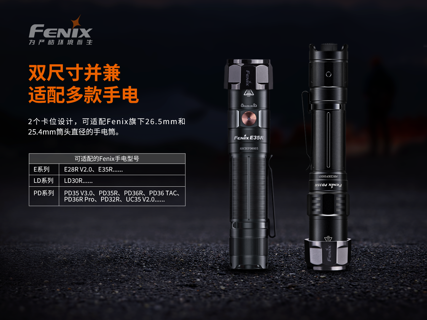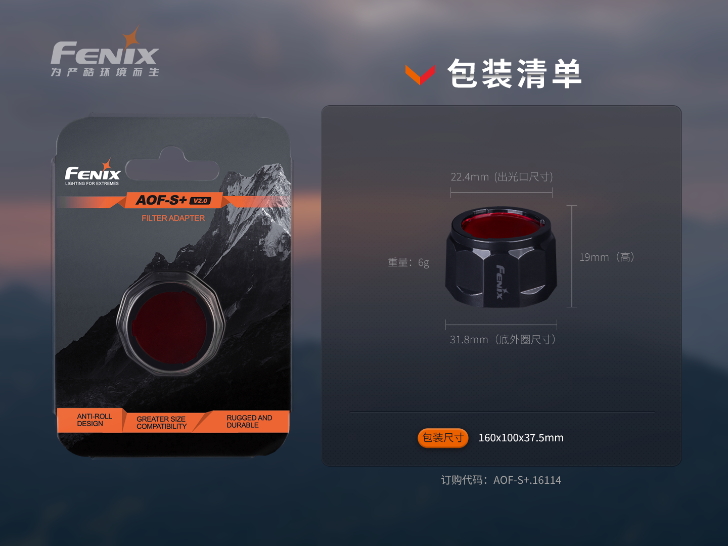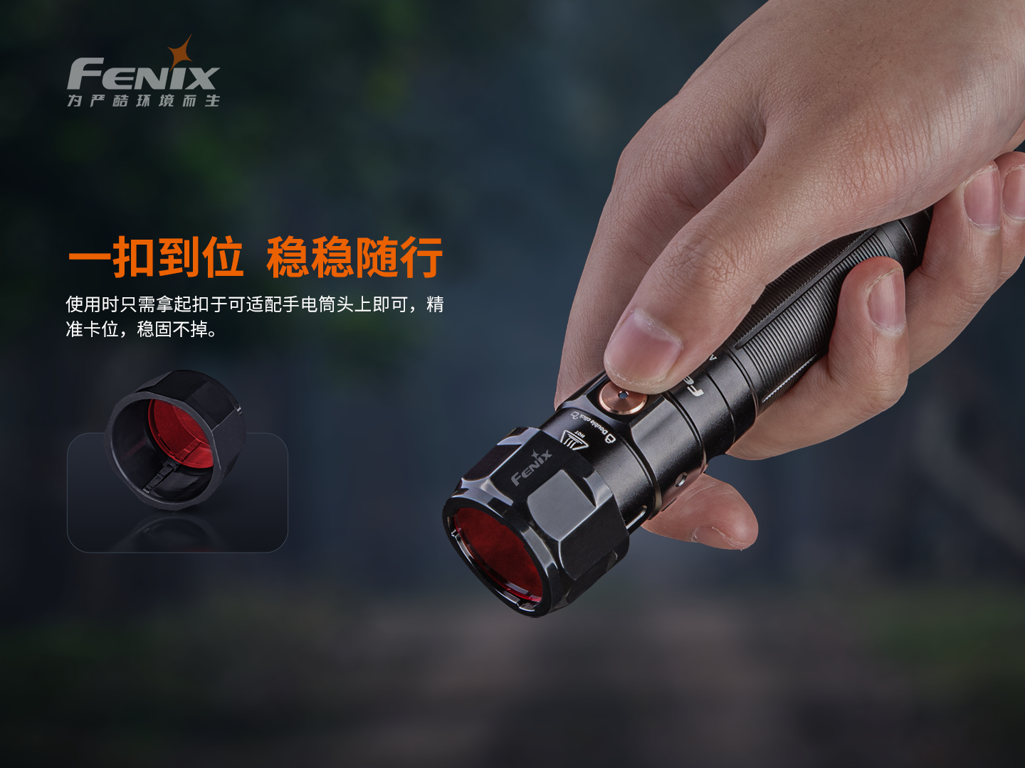 Fenix AOF-S+V2.0濾片采用紅色玻璃、底座采用PC 2805的材質(zhì),內(nèi)部設(shè)計了2個卡位,可輕松適配Fenix旗下26.5mm 和25.4mm筒頭直徑的手電筒,適用于戶外、軍警、戰(zhàn)術(shù)、狩獵等場景。