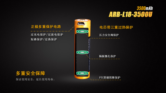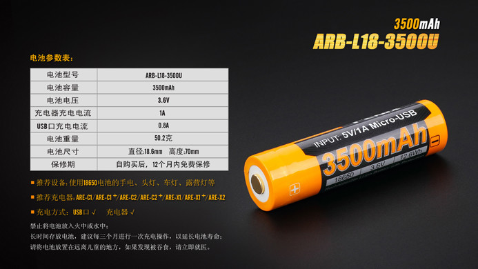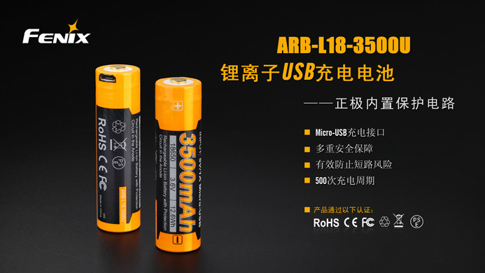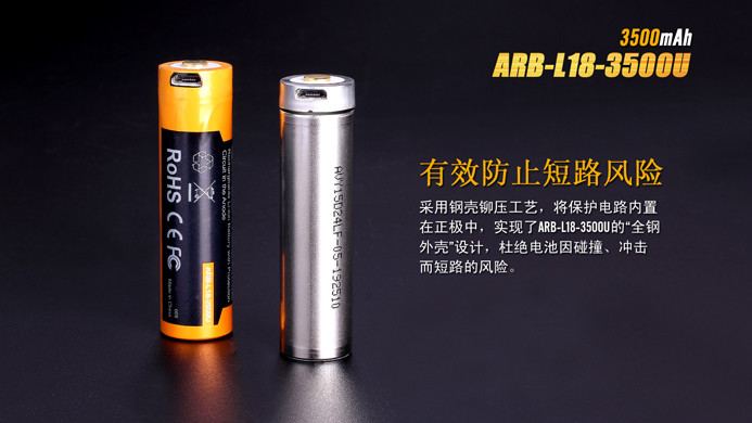 Fenix ARB-L18-3500U是一款高性能、高容量、多種充電方式的鋰電池;既可以通過自身的USB接口完成充電,也可以通過充電器完成充電。采用鋼殼鉚壓工藝,將保護電路內(nèi)置在正極中,實現(xiàn)了ARB-L18-3500U的“全鋼外殼”設計,杜絕電池因碰撞、沖擊而短路的風險。