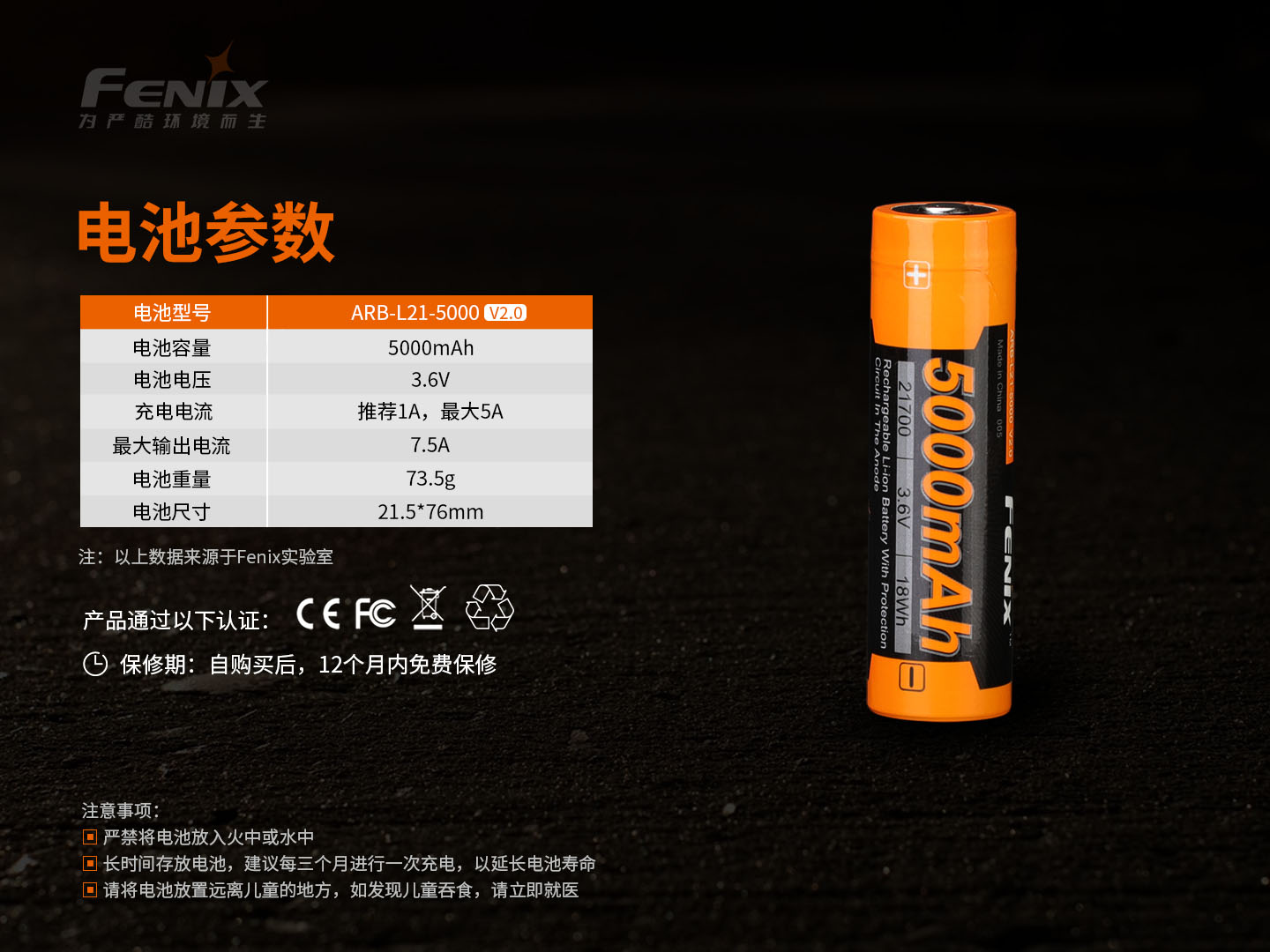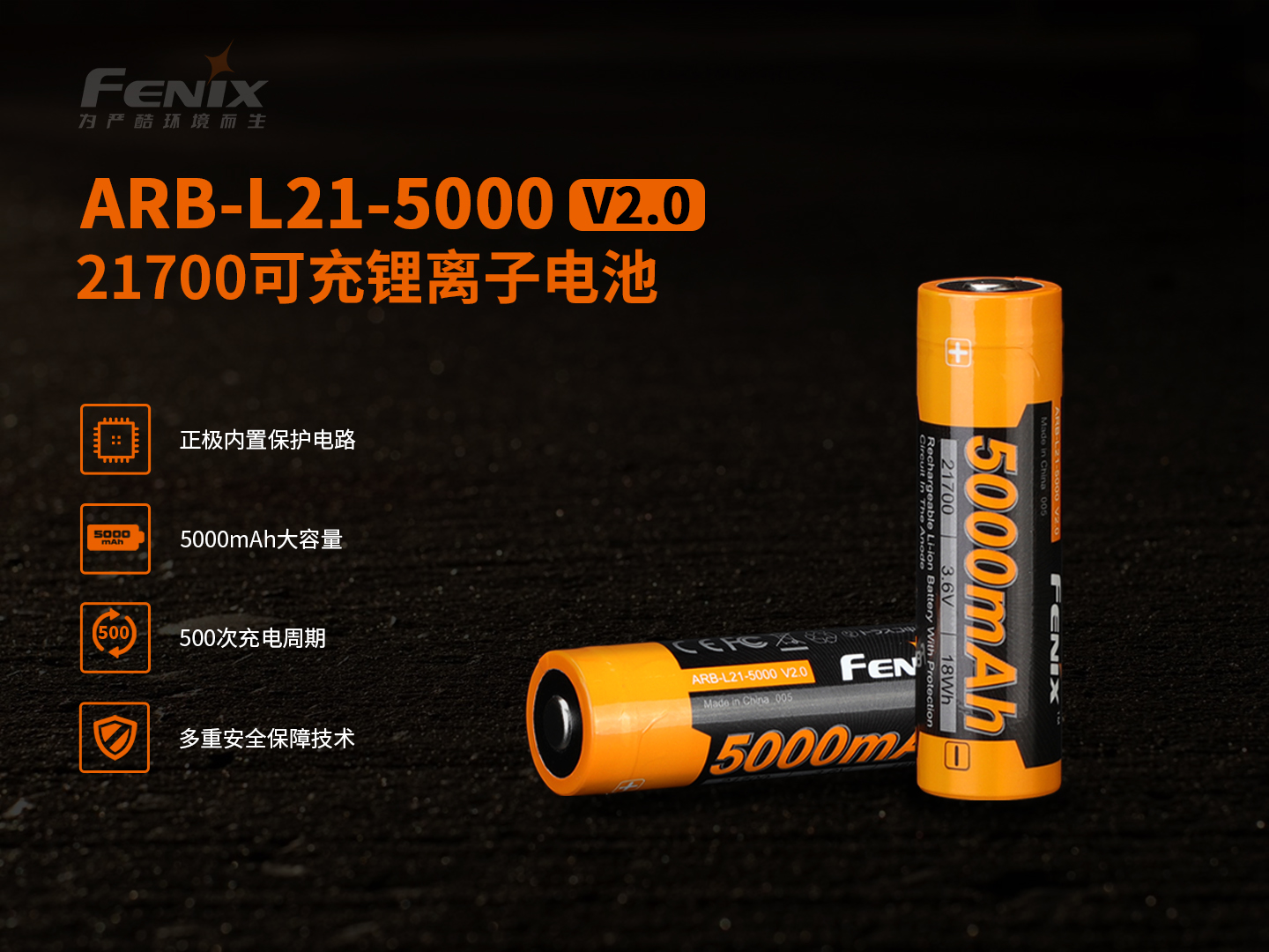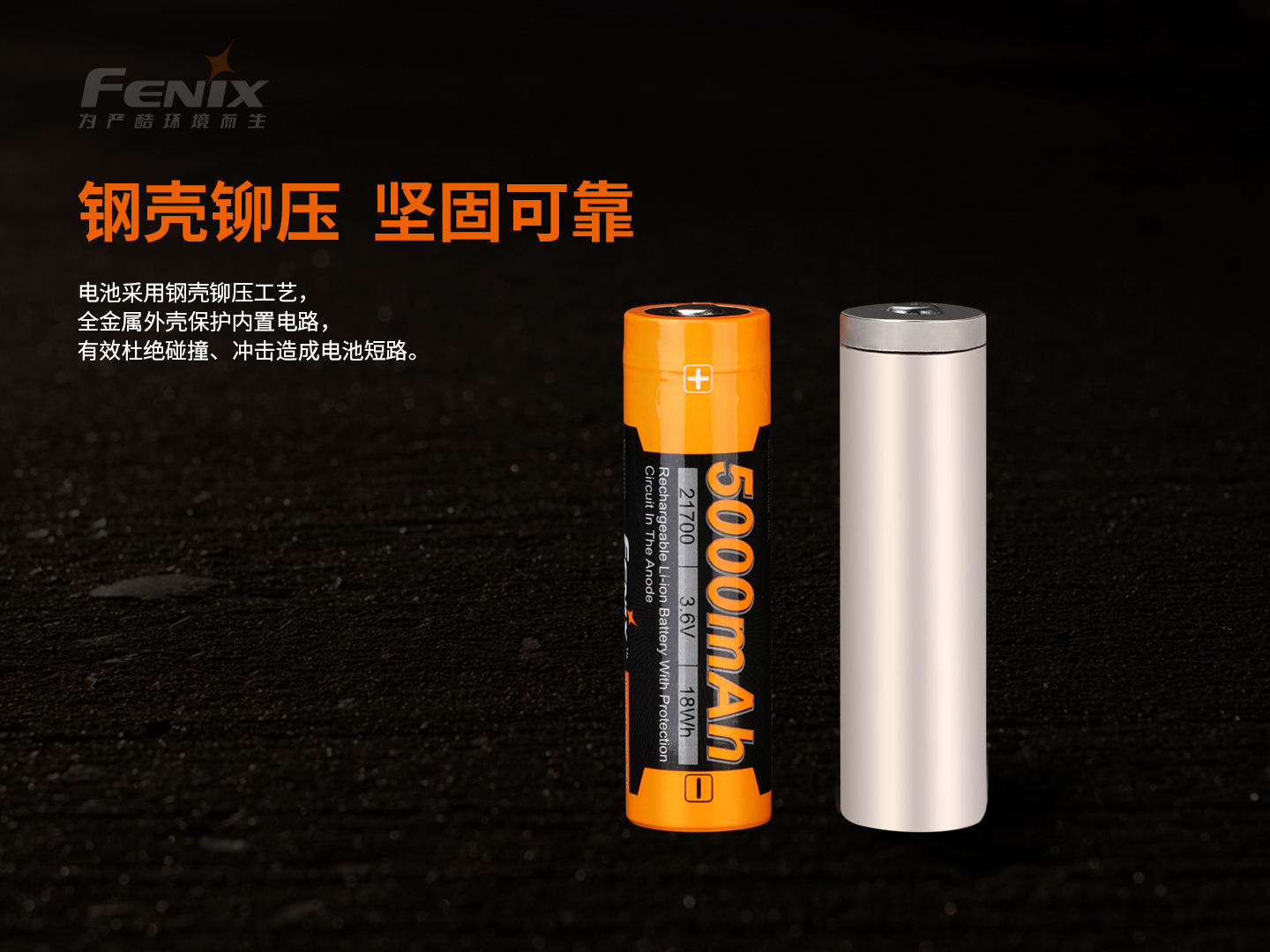 ARB-L21-5000 V2.0是Fenix最新推出的21700可充鋰離子電池,動力強勁,性能穩(wěn)定,擁有5000mAh大容量,能為照明產(chǎn)品帶來更加持久的續(xù)航時間。多重安全保障,延長電池壽命,使用更放心;鋼殼鉚壓工藝,給電池提供強硬保護;安全氣孔設(shè)計,迅速排出內(nèi)部廢氣。