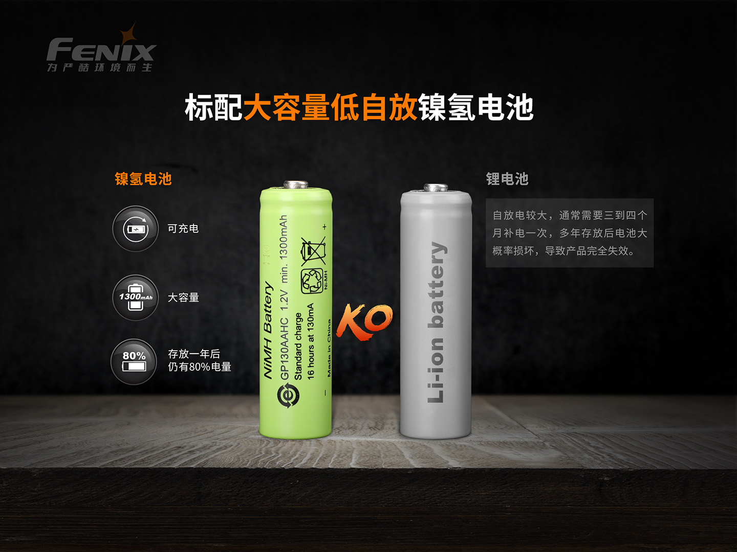 標(biāo)配1節(jié)1300mAh的低自放電AA鎳氫充電電池,兼容其他AA電池。
