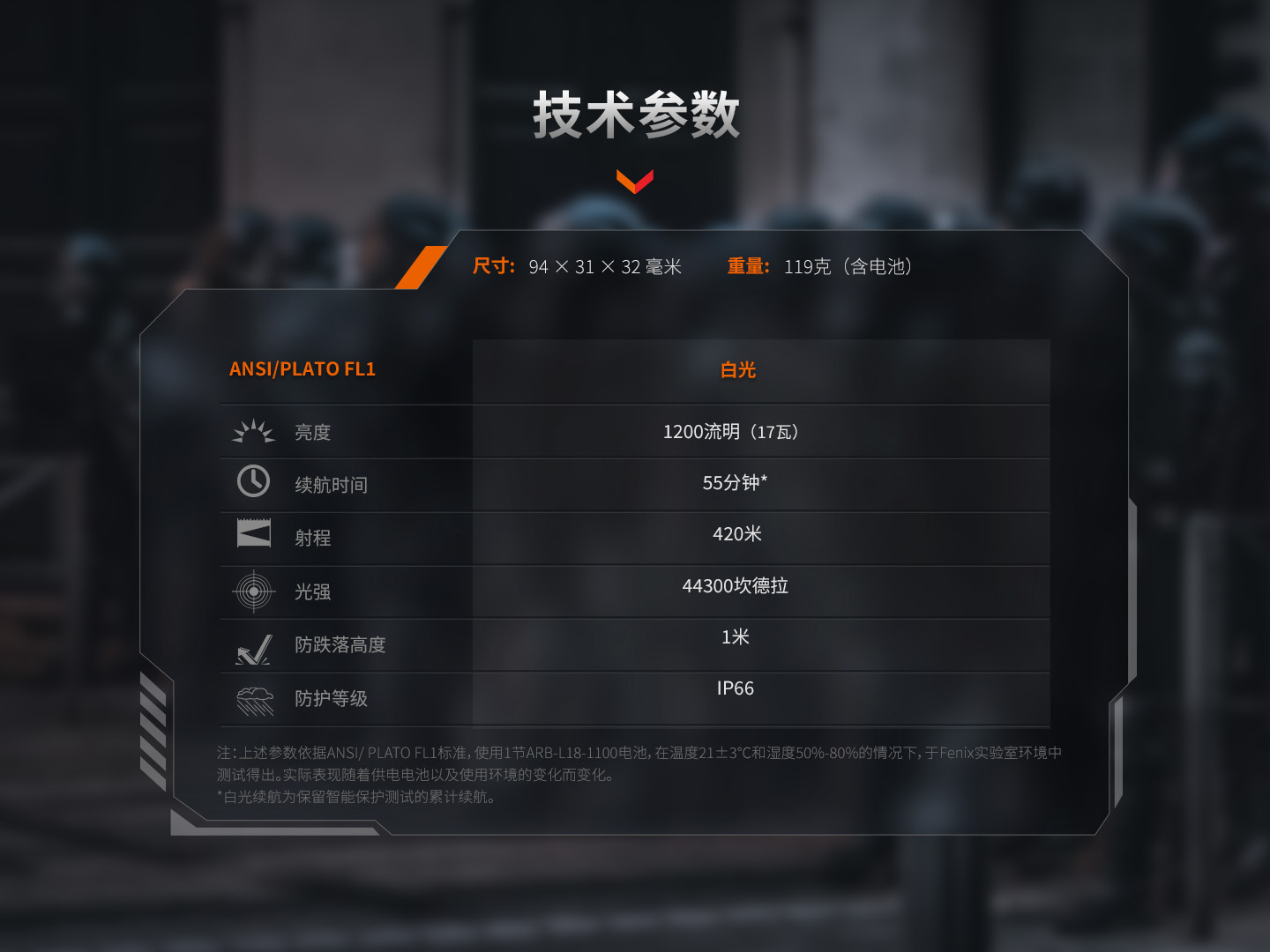 最高亮度1200流明,最遠(yuǎn)射程420米
