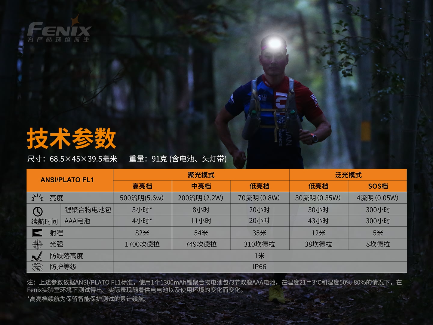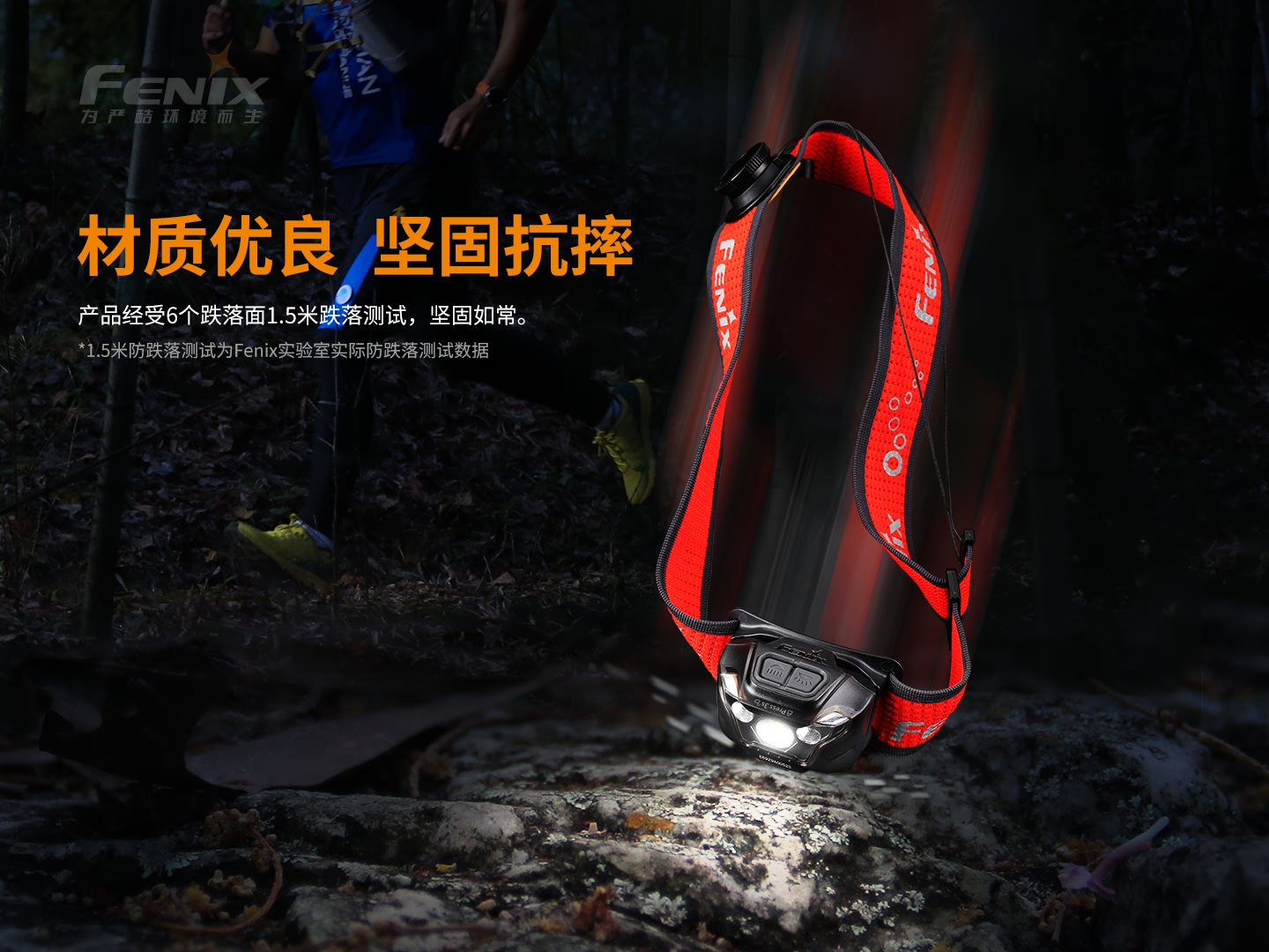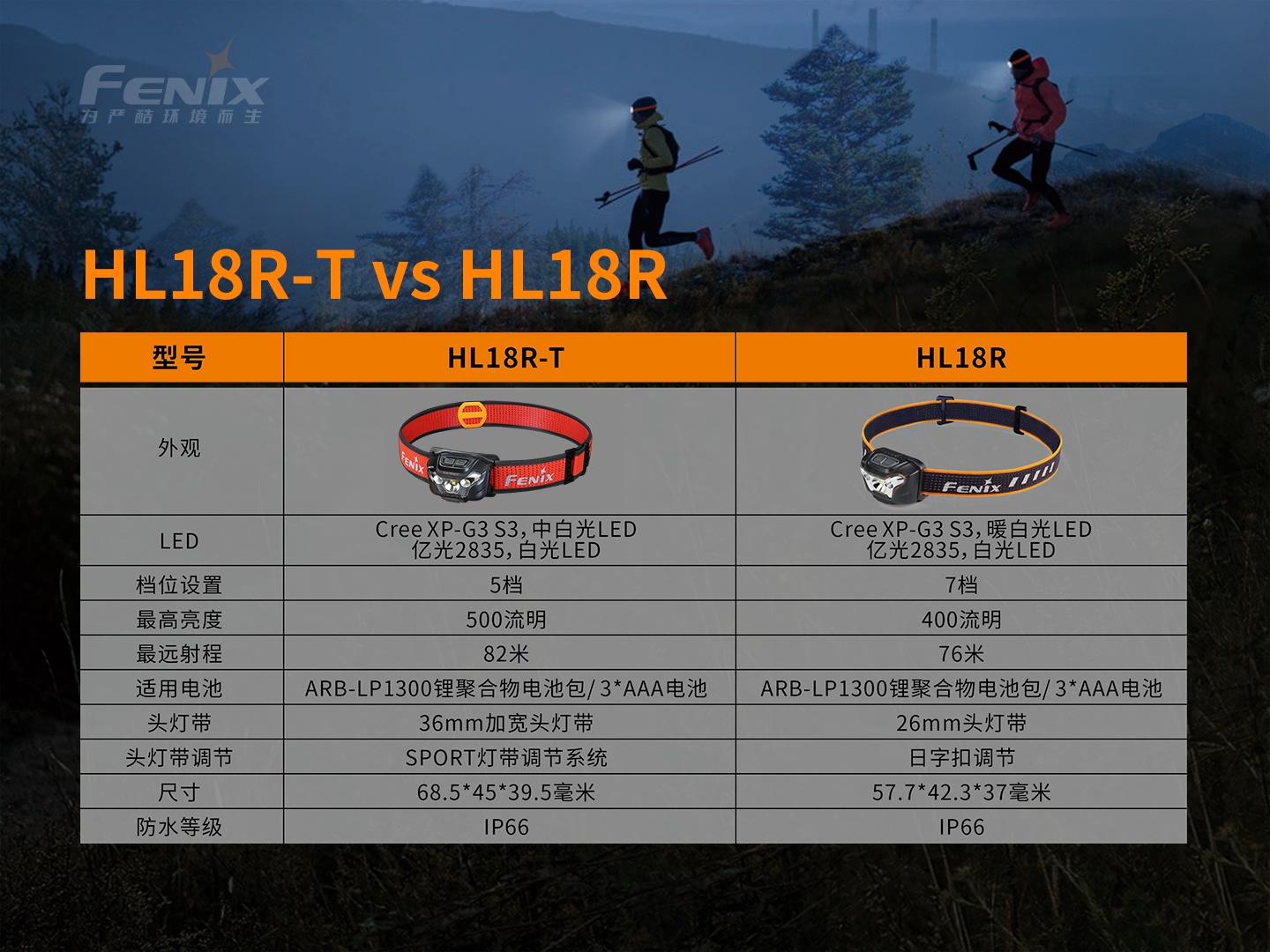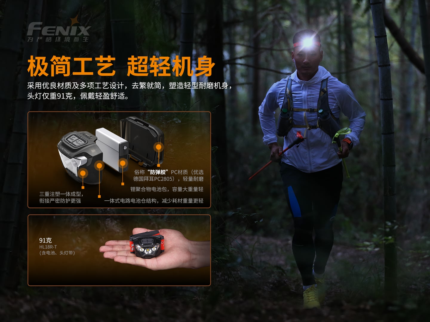 Fenix HL18R-T是一款輕量高續(xù)航越野跑頭燈;擁有三檔聚光照明、一檔泛光照明和SOS功能;標配一個可充電的1300mAh鋰聚合物電池包,綠色環(huán)保;兼容3節(jié)AAA電池;最高亮度達500流明,越野模式下續(xù)航時長可達20小時;雙按鍵獨立控制聚泛光,三重注塑工藝減輕機身重量,鏤空彈性頭燈帶佩戴穩(wěn)固舒適,加上IP66的防護等級,是您戶外越野跑步的上佳之選。