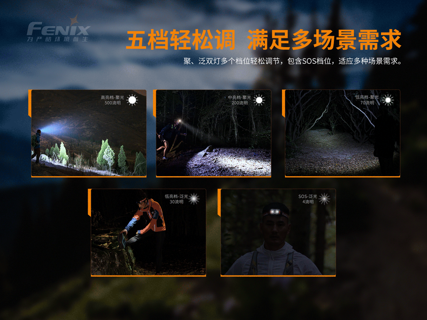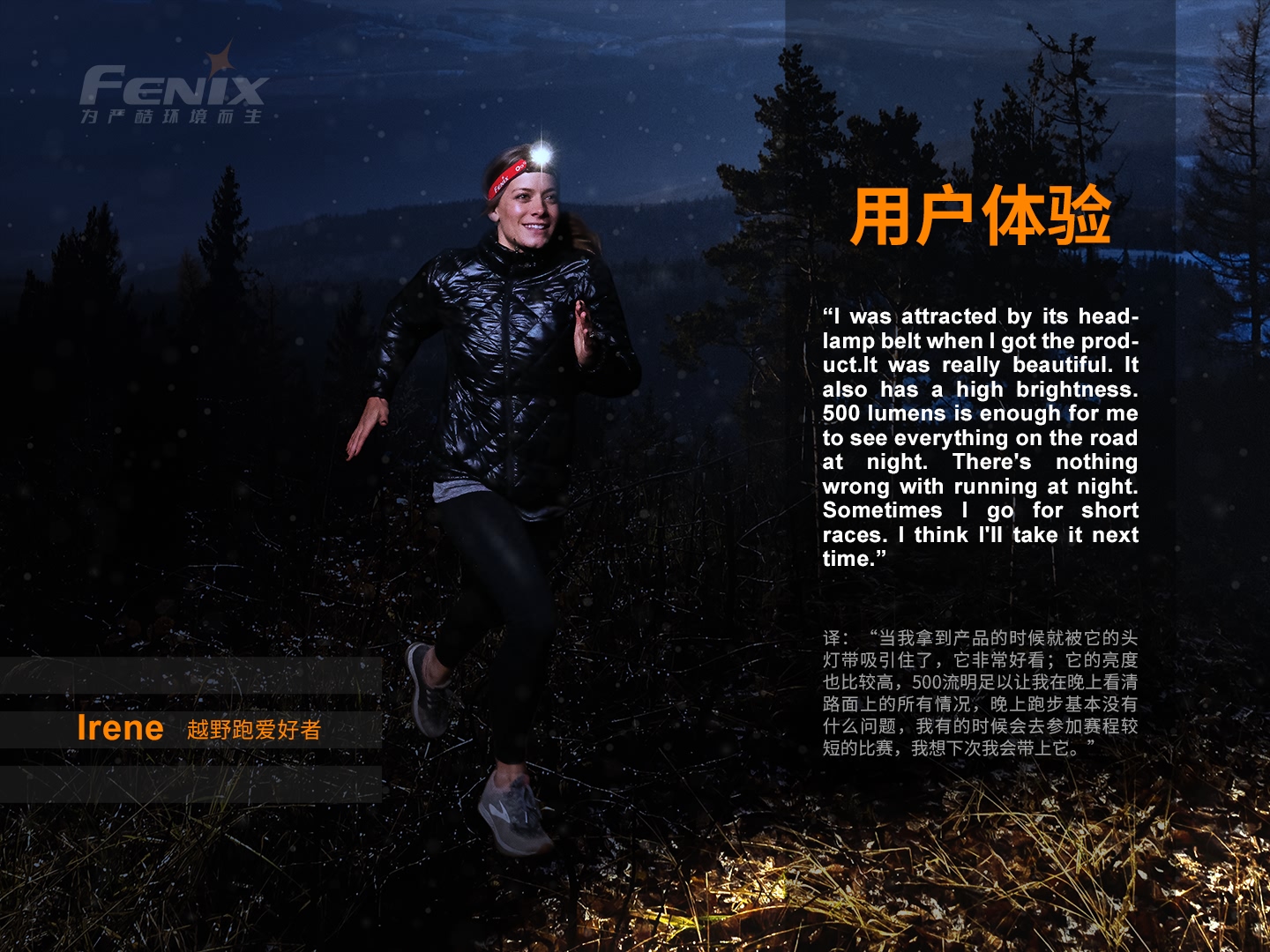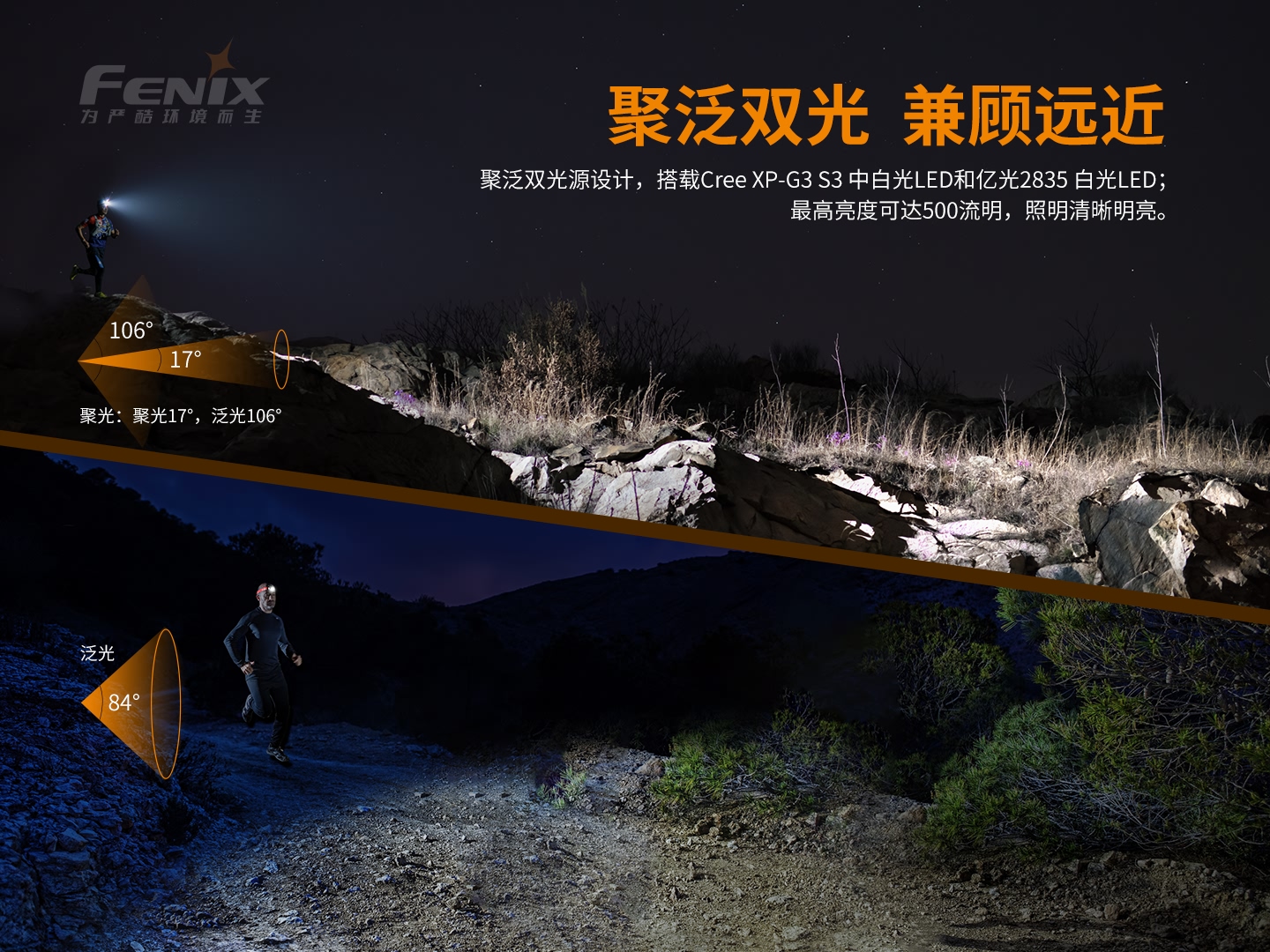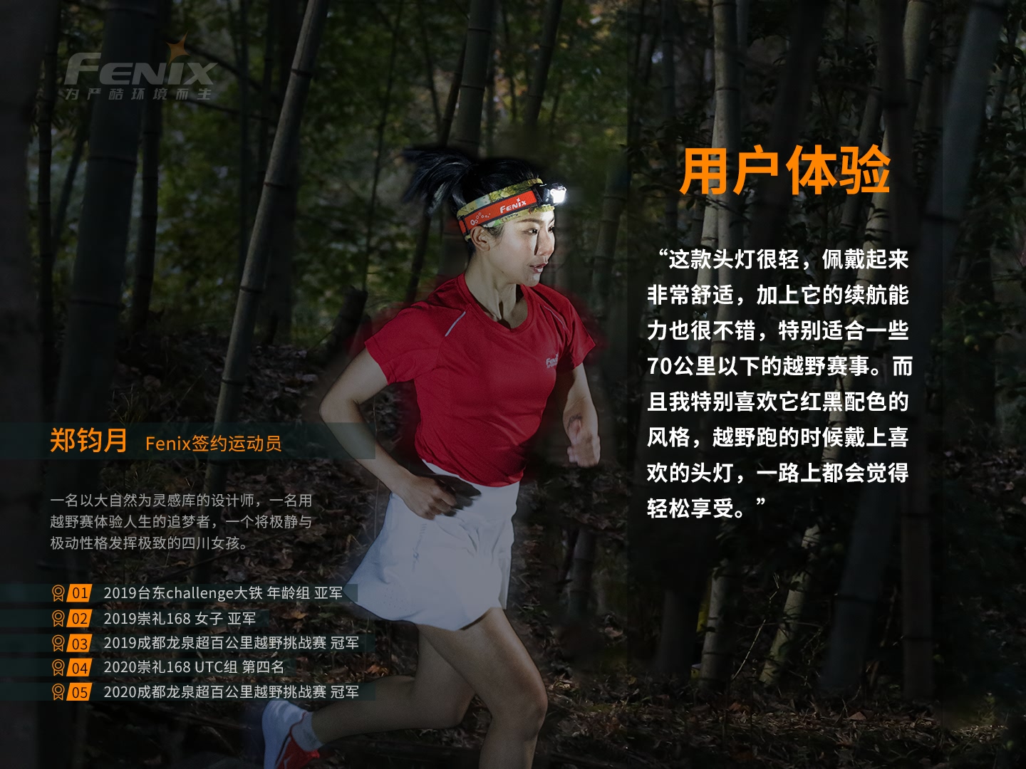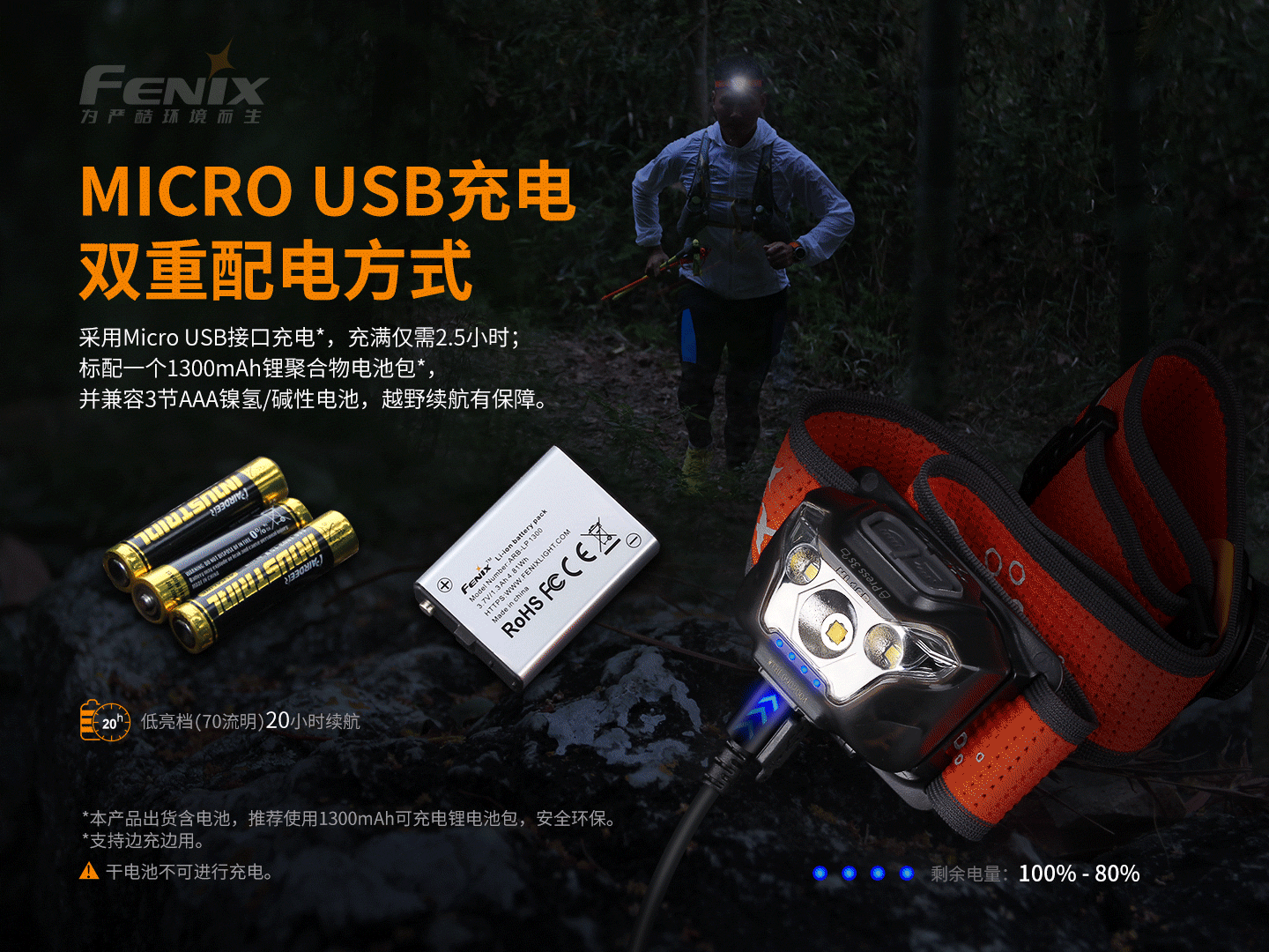 Fenix HL18R-T是一款輕量高續(xù)航越野跑頭燈;擁有三檔聚光照明、一檔泛光照明和SOS功能;標配一個可充電的1300mAh鋰聚合物電池包,綠色環(huán)保;兼容3節(jié)AAA電池;最高亮度達500流明,越野模式下續(xù)航時長可達20小時;雙按鍵獨立控制聚泛光,三重注塑工藝減輕機身重量,鏤空彈性頭燈帶佩戴穩(wěn)固舒適,加上IP66的防護等級,是您戶外越野跑步的上佳之選。