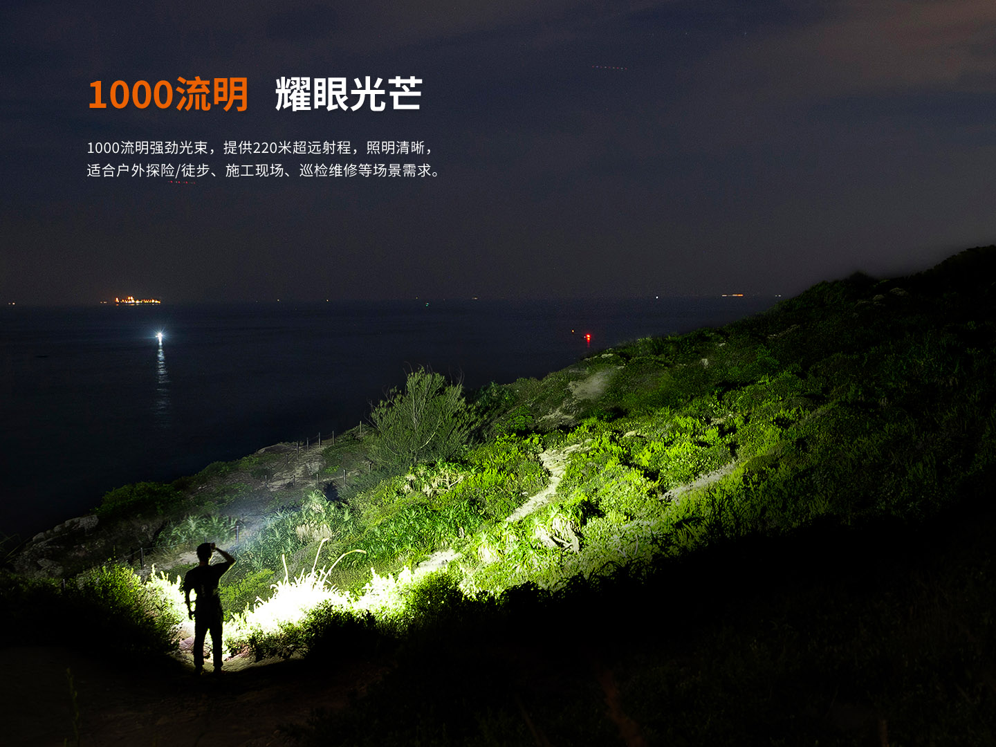 旋鈕+按鍵組合式開關(guān)設(shè)計,可鎖定及快速調(diào)節(jié)模式和檔位亮度;旋轉(zhuǎn)調(diào)焦環(huán)可切換聚、泛光。