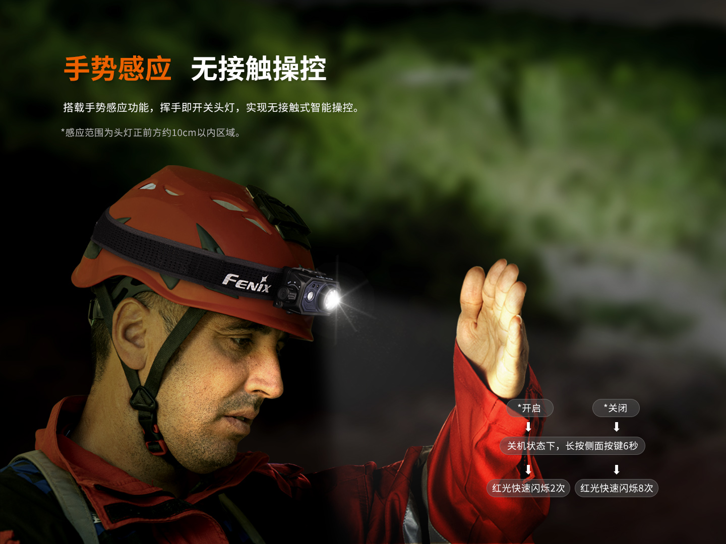 開機狀態(tài)下,當手勢感應(yīng)功能開啟時,在頭燈前方感應(yīng)范圍內(nèi)揮手即可臨時關(guān)閉頭燈,再次揮手即可開啟關(guān)機前的檔位;當手勢感應(yīng)功能關(guān)閉時,則不響應(yīng)手勢操作。