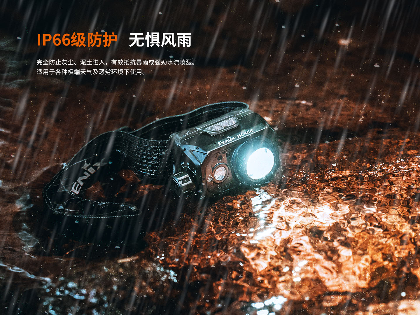 HL45R的防水防塵等級為IP66,可以承受暴雨和強水流噴濺,完全防塵防土,可全天候使用。
