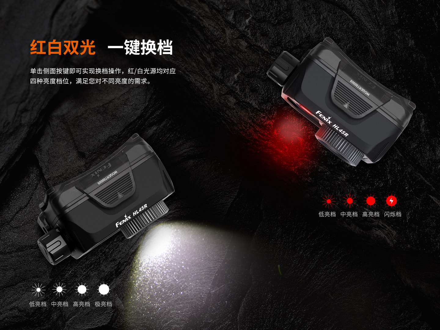 HL45R使用的是1顆Luminus SFT25R 冷白光,色溫6000-6500K。1顆OSRAM GR QSSPA1.23紅光LED;Fenix暫不提供更換LED服務(wù),同時也不建議使用者自主更換LED,會有影響產(chǎn)品性能以及造成產(chǎn)品損壞的風(fēng)險。