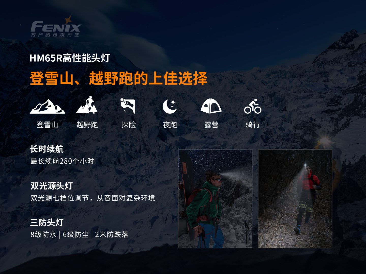 Fenix HM65R是一款適合遠(yuǎn)近照明的IP68級高性能頭燈。采用白光和中白光雙光源,最高1400流明亮度,最大射程為163米,最長續(xù)航300小時;雙按鍵單獨控制,聚光四檔最高1000流明,泛光三檔亮度最高400流明;采用1節(jié)18650鋰離子電池配電,通兼容2節(jié)一次性CR132A鋰電池,配備USB Type-C充電接口;HM65R是您進(jìn)行長時間、高強(qiáng)度戶外活動的上佳選擇。