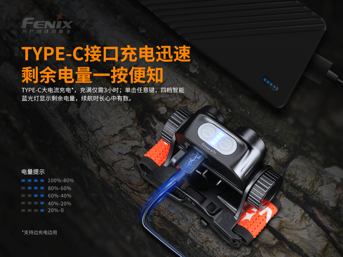 能。充電時,支持點亮聚光模式或泛光模式低亮檔,充滿后不會自動開機。