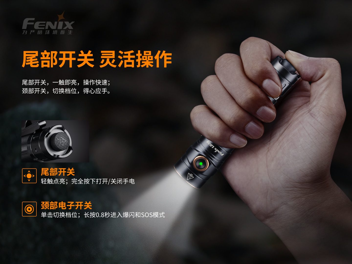 尾部戰(zhàn)術(shù)開關(guān),一觸即亮;頸部電子開關(guān),一鍵調(diào)光換檔