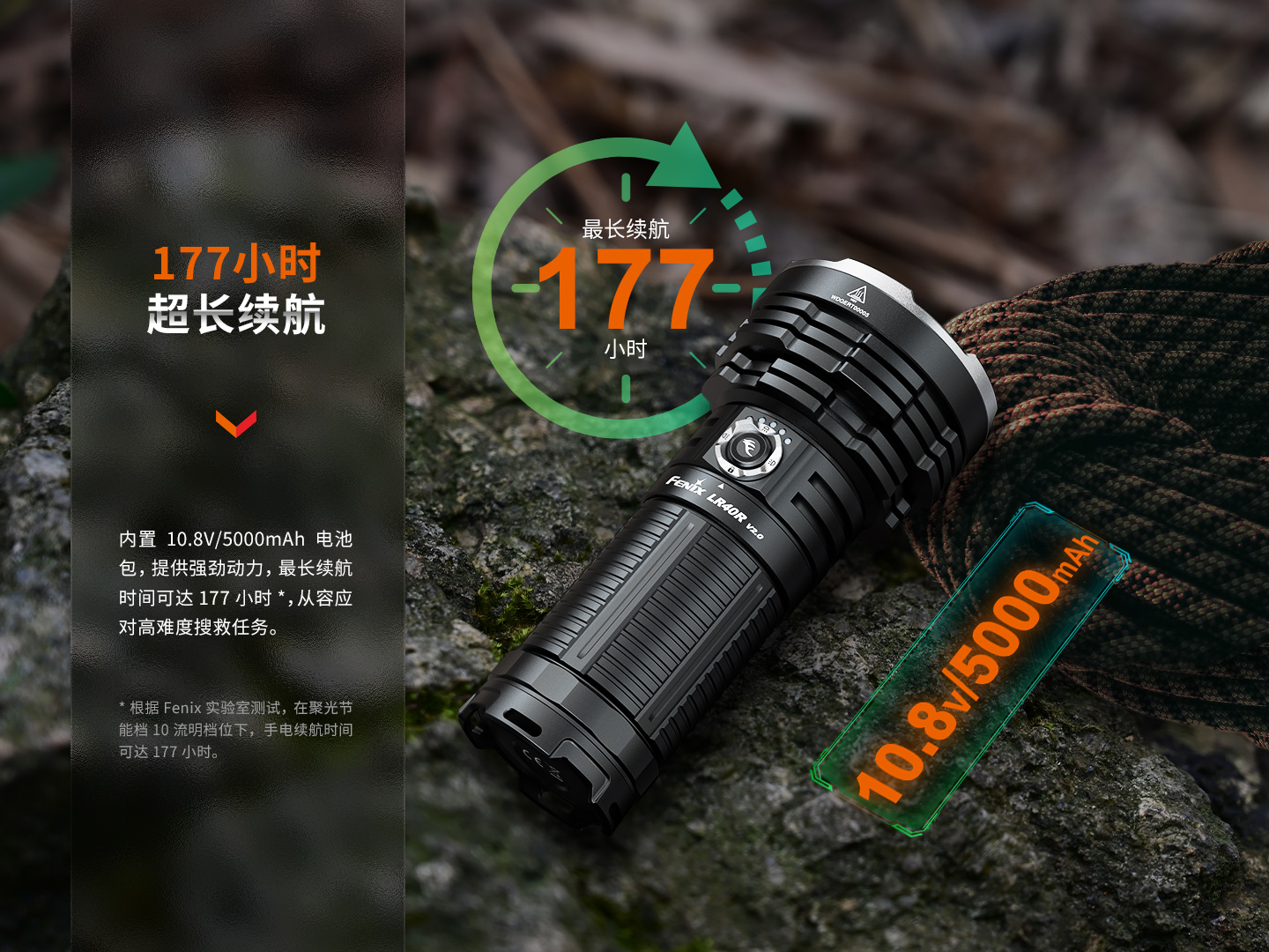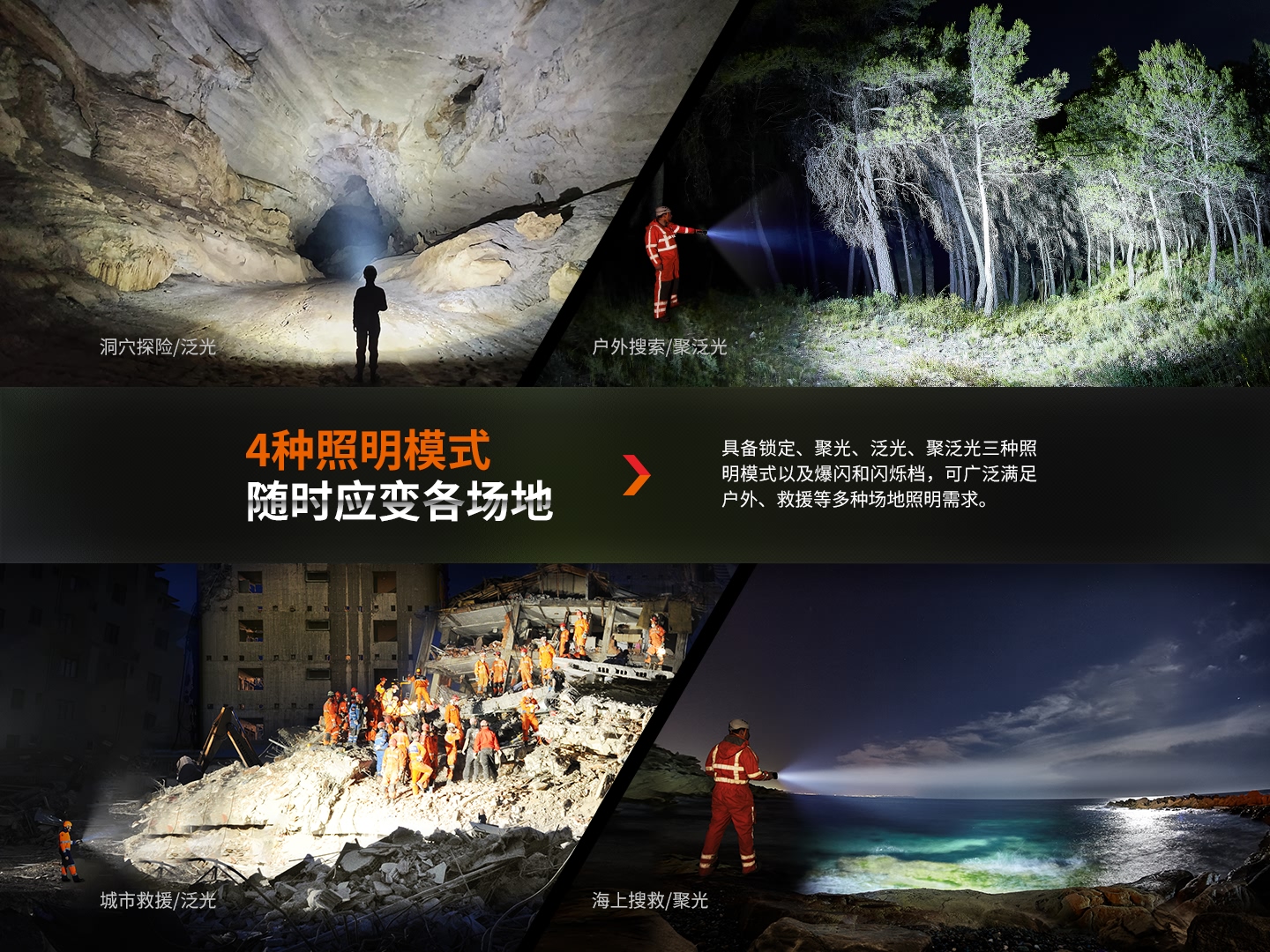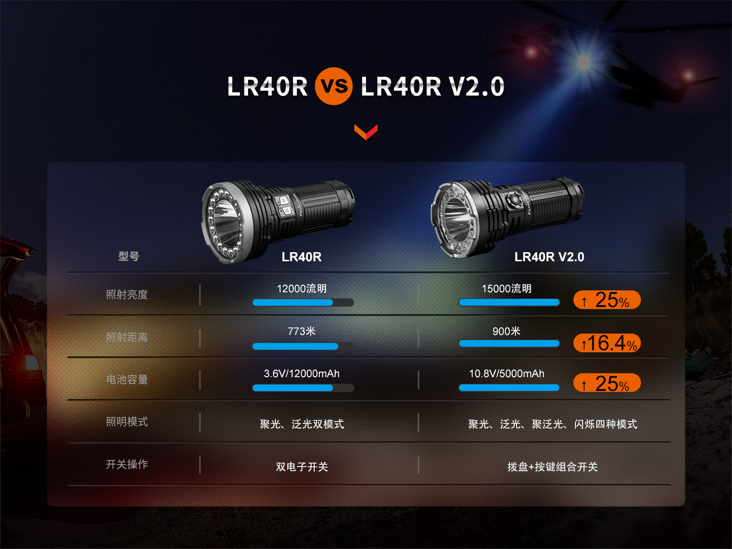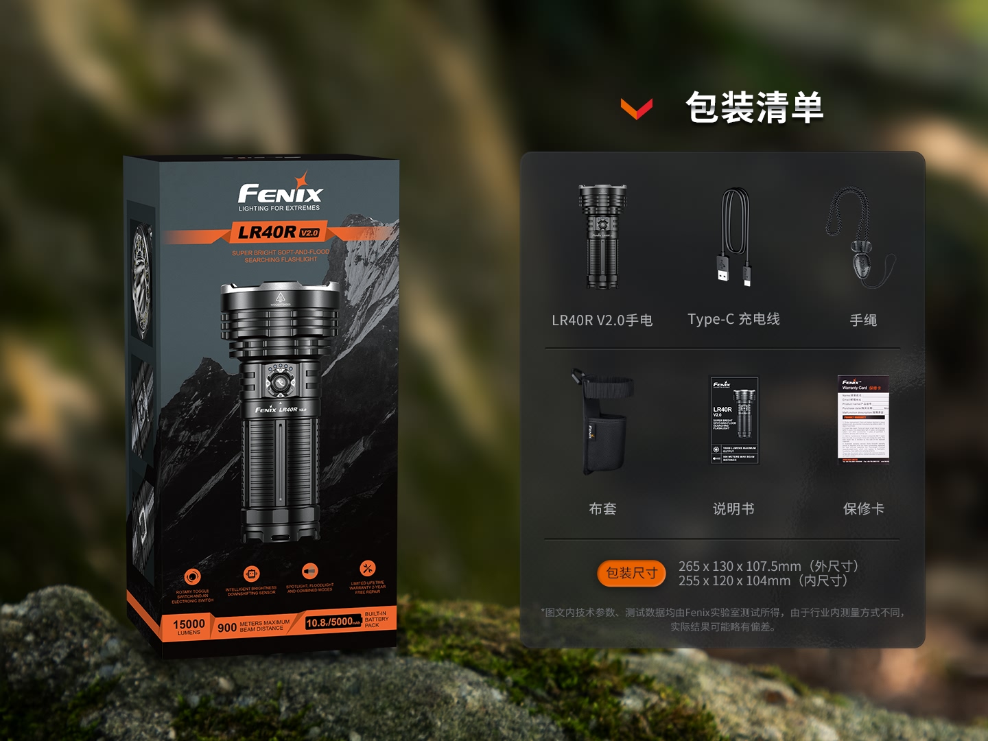 Fenix LR40R V2.0是一款超高亮聚泛光搜索手電。它的主要亮點在于: