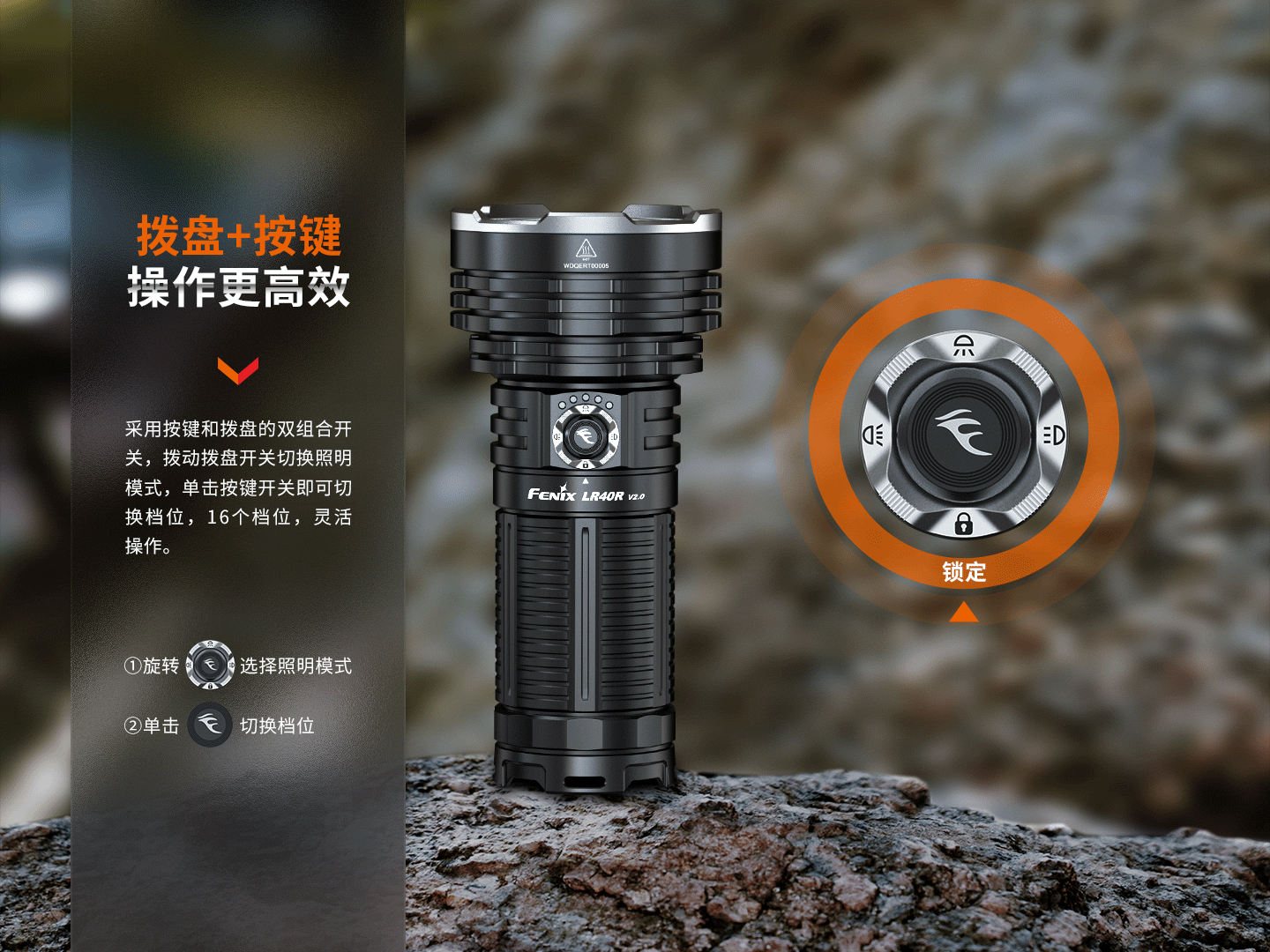Fenix LR40RV2.0是一款聚、泛光源相結(jié)合的高性能可充放電掌上手電,采用全新的撥盤+電子開關(guān)組合,實現(xiàn)單手便攜操作。具備按鍵鎖定、智能溫控、距離感應(yīng)等多種安全可靠功能。是戶外搜索、救援、探洞照明、汽車備用的上佳選擇。