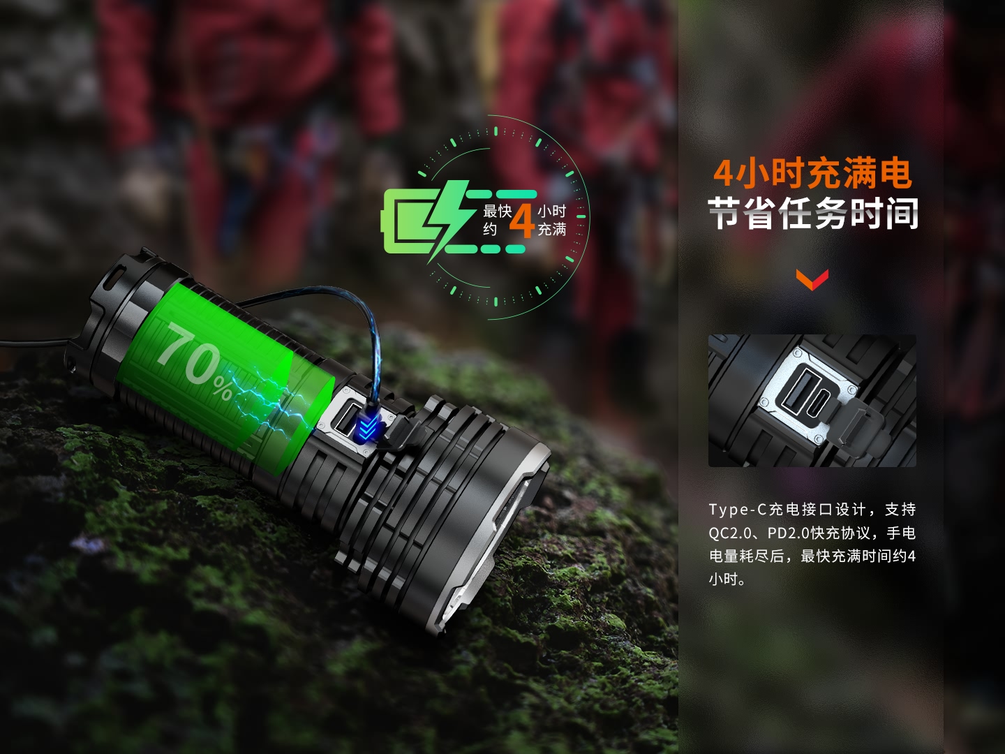 LR40R V2.0機身設(shè)計有Type-C快充接口,支持QC2.0、PD2.0快充協(xié)議;手電電量耗盡后,最快充滿時間約4小時。
