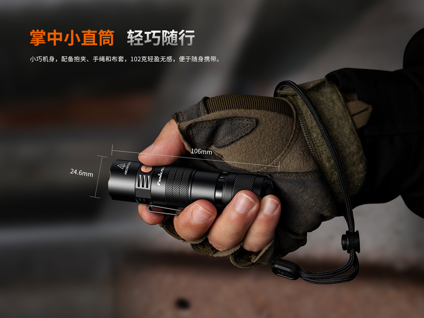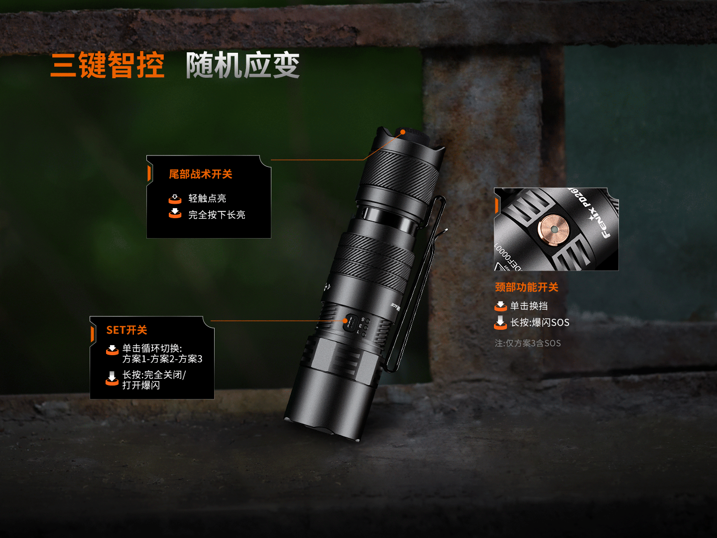 Fenix PD26R ACE是一款緊湊型充電戰(zhàn)術(shù)小直筒,采用一顆Luminus SFT25R燈珠,最高亮度1300流明,最遠(yuǎn)射程354米。標(biāo)配1節(jié)1600mAh的18350電池,頸部隱藏式TYPE- C充電口,充電快捷。創(chuàng)新的SET模式設(shè)計(jì),用戶能夠根據(jù)不同場(chǎng)景和個(gè)人偏好自定義亮度方案。尾部開(kāi)關(guān)一觸即亮,快速響應(yīng);頸部開(kāi)關(guān)操作簡(jiǎn)易;頸部SET開(kāi)關(guān),快速切換不同方案。機(jī)身小巧緊湊,配備雙向抱夾,便于攜帶。PD26R ACE滿足戶外和戰(zhàn)術(shù)多種用途,是戶外徒步、軍警勤務(wù)的上佳選擇。