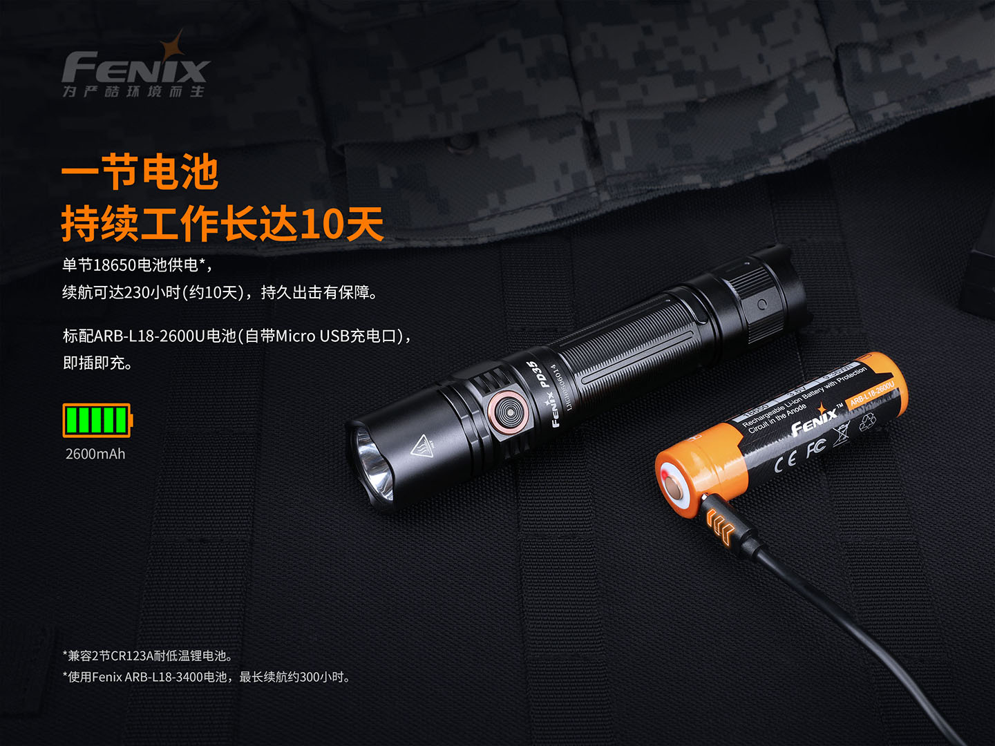標(biāo)配1節(jié)18650可充電鋰離子電池,兼容2節(jié)CR123A 鋰電池