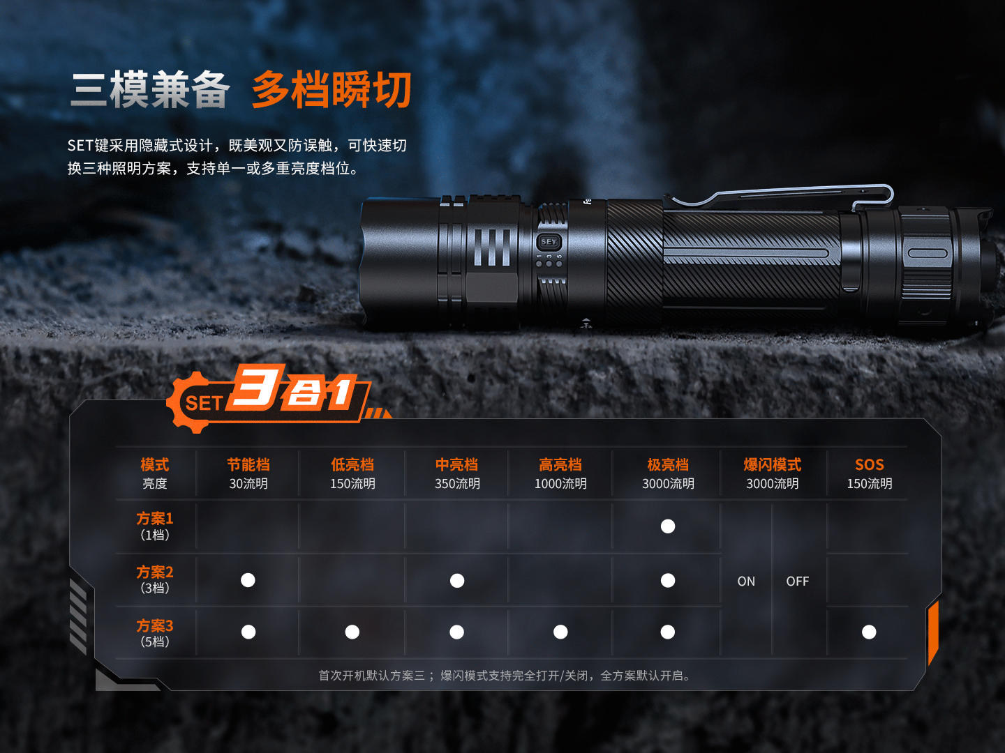 答:在PD36R ACE的SET模式預(yù)設(shè)3種照明方案,可根據(jù)不同場景或自身的使用習(xí)慣靈活選用,切換操作如下: