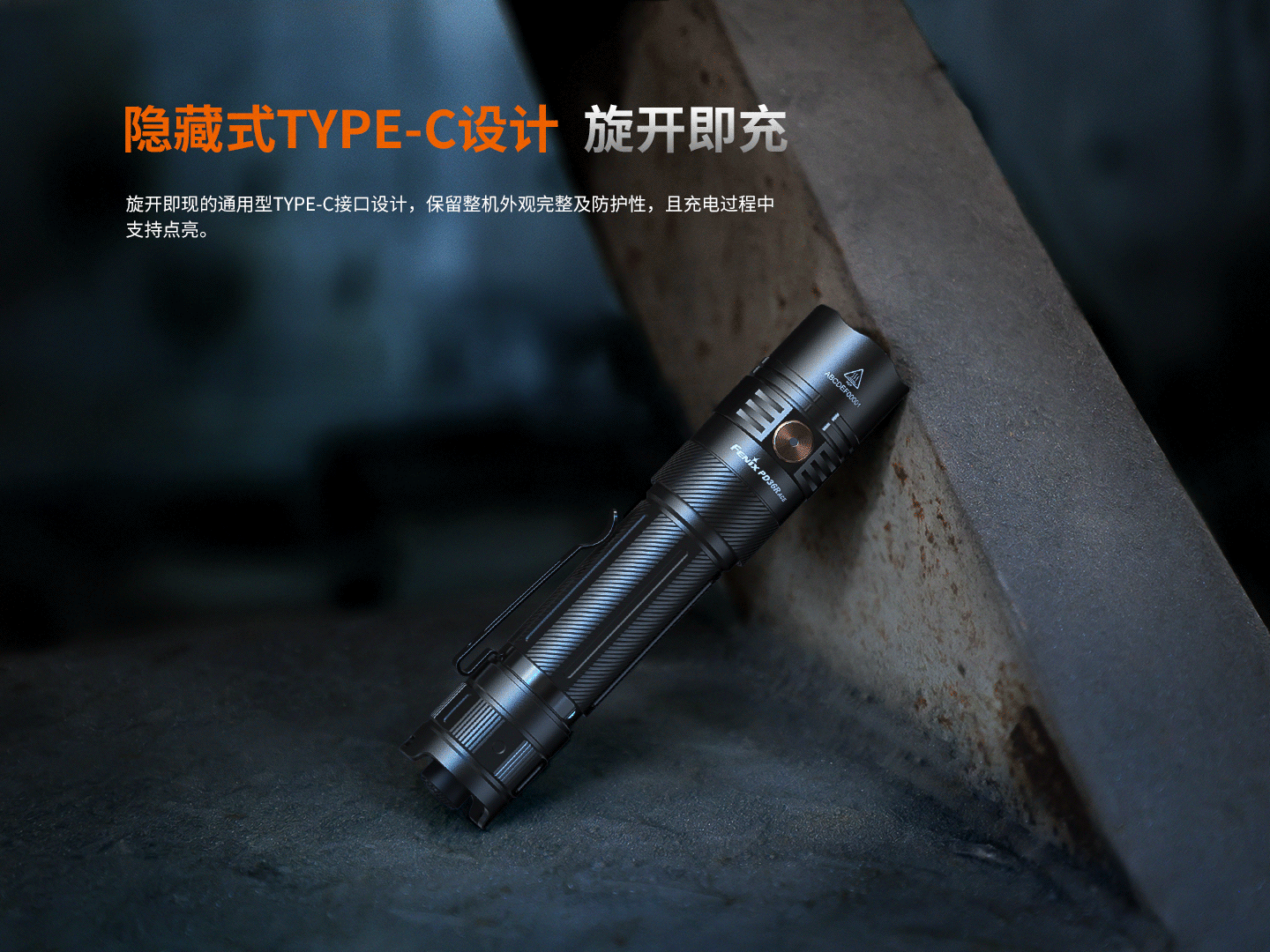 3.手電頸部設(shè)有隱藏式Type-C充電接口,即插即充,方便快捷