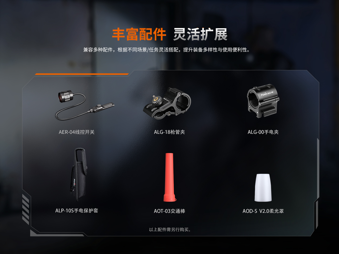 答:AER-04線控開關(guān)、ALG-00手電夾、ALG-18槍管夾、ALP-10S手電保護(hù)套、AOD-S?V2.0柔光罩、AOT-03交通棒等。