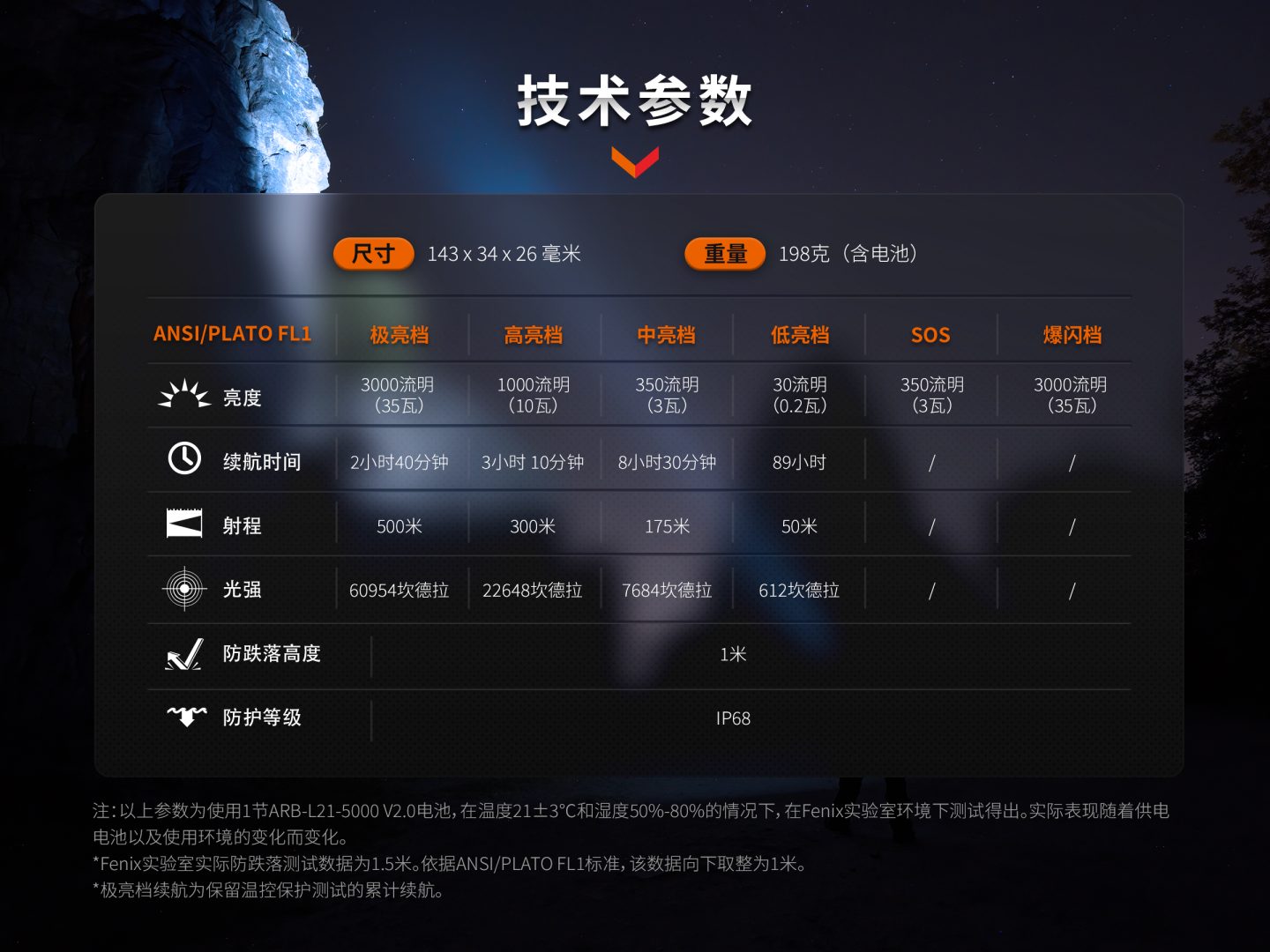 PD40R V3.0的極亮檔續(xù)航時間為2小時40分,但是在3000流明的極亮檔工作時,手電會急劇產(chǎn)生熱量,當熱量達到一定程度時手電會主動降低當前亮度來平衡溫度,所以該續(xù)航時間是PD40R V3.0在智能保護狀態(tài)下的累計時間,是根據(jù)ANSI / PLATO FL1標準在21±3℃的實驗室環(huán)境下自然放電測試所得的真實數(shù)據(jù)。(具體續(xù)航表現(xiàn)可查看說明書續(xù)航曲線表)