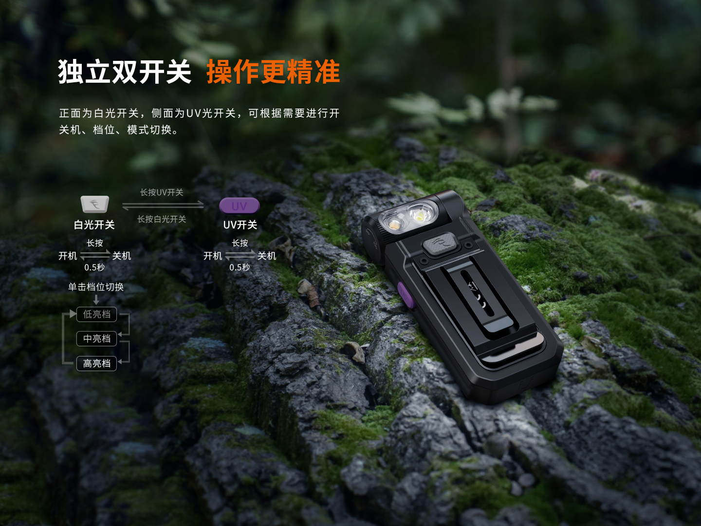 正面白光開關(guān)以及側(cè)面UV光開關(guān),實(shí)現(xiàn)開關(guān),換檔,以及模式切換操作。