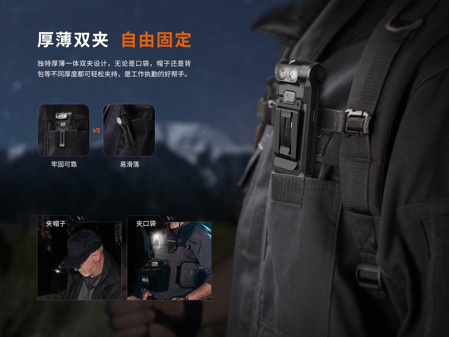 一體厚、薄雙夾設(shè)計(jì),更好的兼容口袋、帽檐等不同厚度夾持。