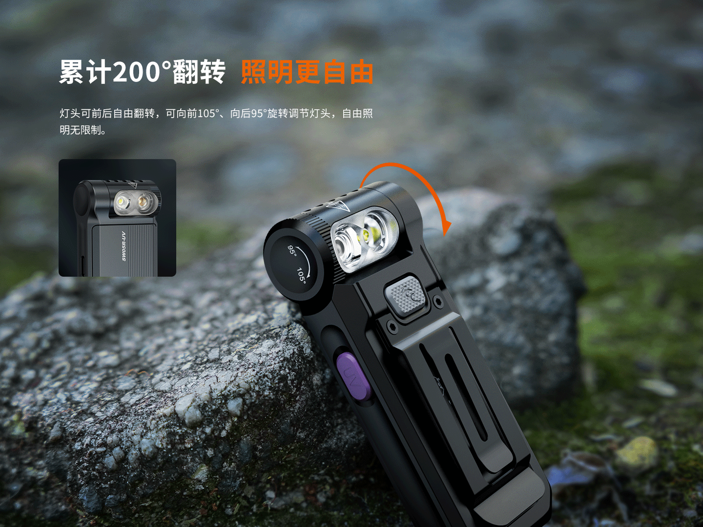 可向前105°、向后95°旋轉(zhuǎn)調(diào)節(jié)燈頭,滿足多角度照明需求。