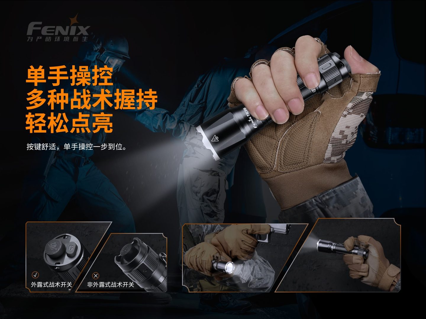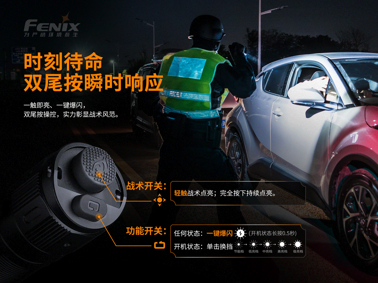 2. 戰(zhàn)術(shù)雙尾按控制,快速實現(xiàn)一觸即亮、一鍵爆閃
