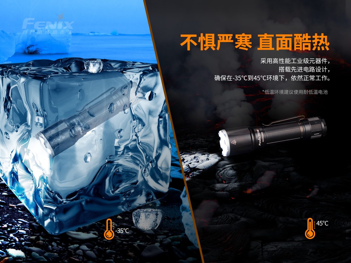 燈具長時間以極亮檔工作時會累積大量熱量,為避免外殼溫度過高影響使用舒適度,當電路檢測到溫度到達60℃,會逐漸階梯降低當前檔位的亮度以避免手電迅速過熱,待溫度降低后,會自動逐漸遞增亮度,直到恢復極亮檔的初始亮度。