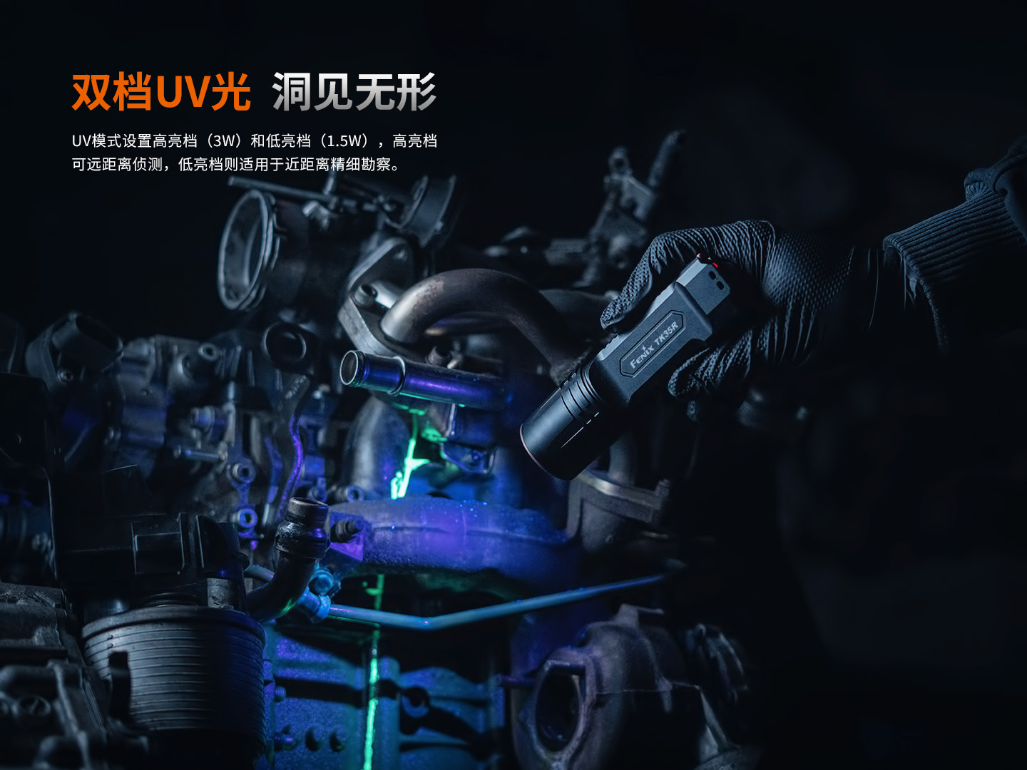 - 雙檔UV光 洞見無形UV模式設(shè)置了高亮檔(3W)和低亮檔(1.5W),高亮檔可遠(yuǎn)距離快速偵測血跡、體液等痕跡,低亮檔則適于近距離精細(xì)勘察。