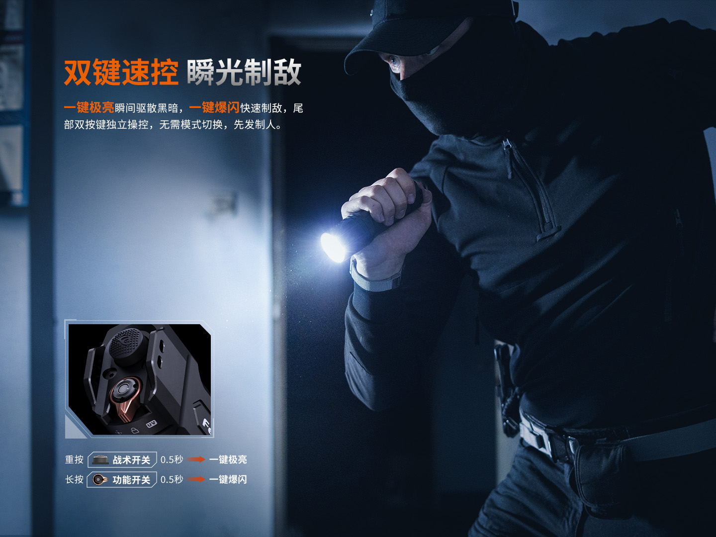 - 雙鍵速控 瞬光制敵一鍵極亮瞬間驅(qū)散黑暗,一鍵爆閃快速制敵致盲,雙尾部按鍵獨立操控
