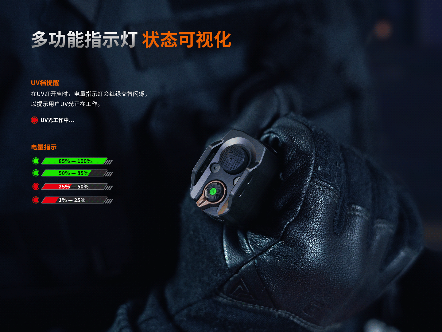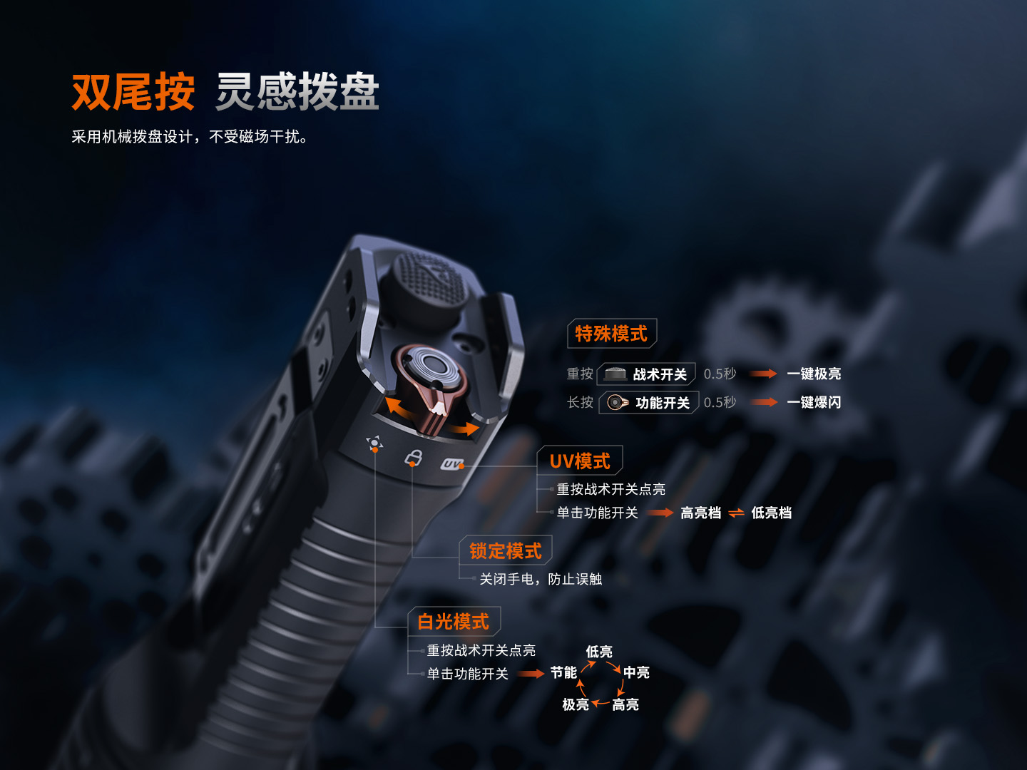 - 靈感撥盤Fenix靈感撥盤 ,采用機械撥盤設(shè)計,不受磁場干擾,左右旋轉(zhuǎn)切換白光、鎖定以及UV模式