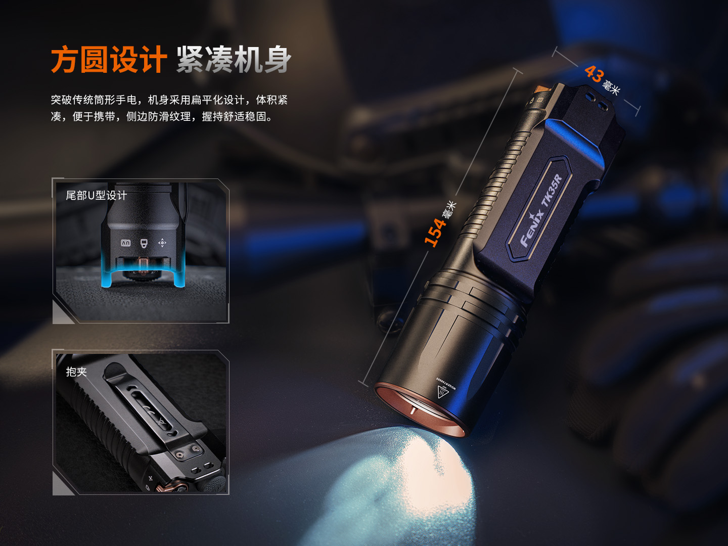 - 方圓設(shè)計 緊湊機身突破傳統(tǒng)筒形手電,機身采用扁平化設(shè)計,結(jié)構(gòu)緊湊,便于攜帶,側(cè)邊防滑紋理,手感舒適,握持更穩(wěn)固。。