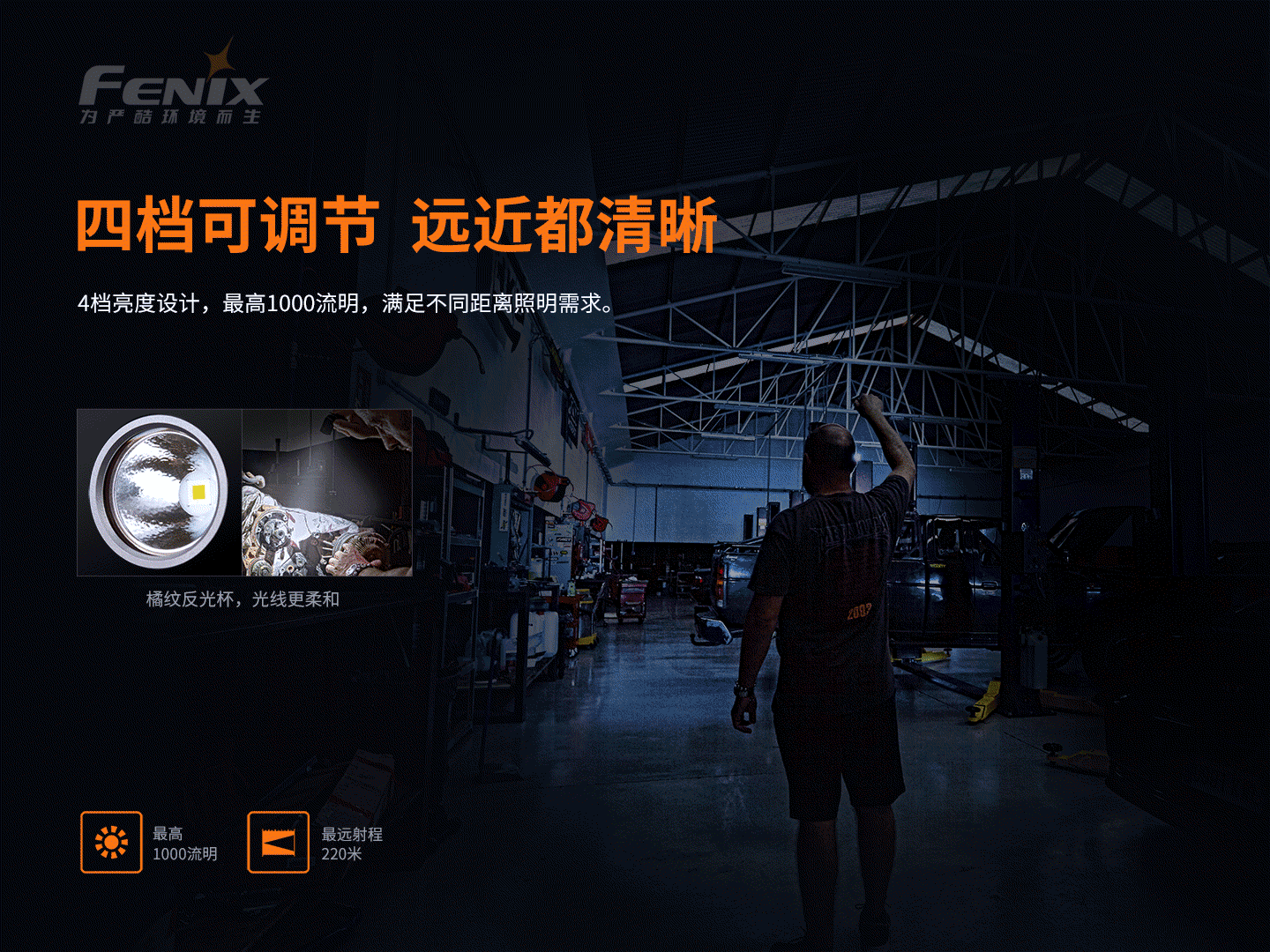最高亮度1000流明(功率10瓦),最遠(yuǎn)射程220米
